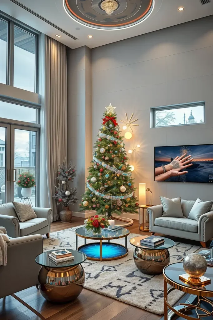 I have incorporated smart LED strands, twinkle effects which are programmable and synchronized music in my designs. This contemporary tree and a sleek furniture including glass coffee tables, chrome lamps and neutral sofas are the complements to this futuristic feel. I prefer to keep the decorations to a minimum as well, using only metallics and clear glass to emphasize the lighting technology as well.