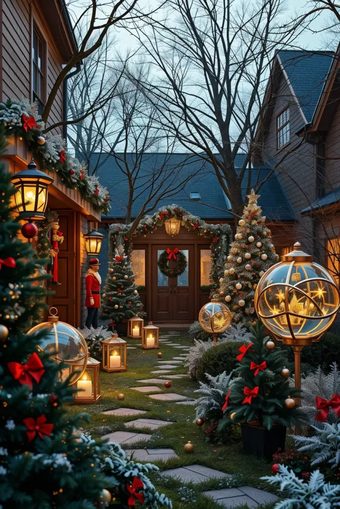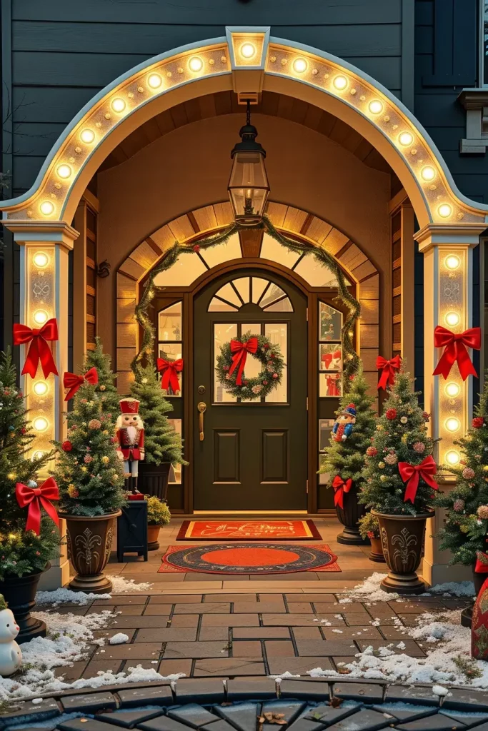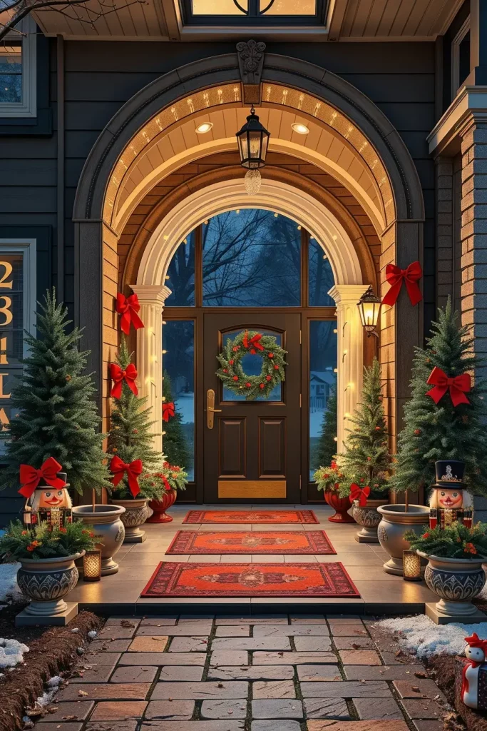 The most important things in an ideal entrance to my mind are the lighted arch leading into the door, evergreen potted with red bows, and a seasonal doormat that drives home the theme. To decorate larger entrances, it is better to include in the festal setting a pair of life-size nutcrackers or glowing lanterns that will also help make the yard appear balanced, symmetrical.