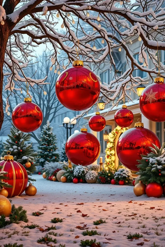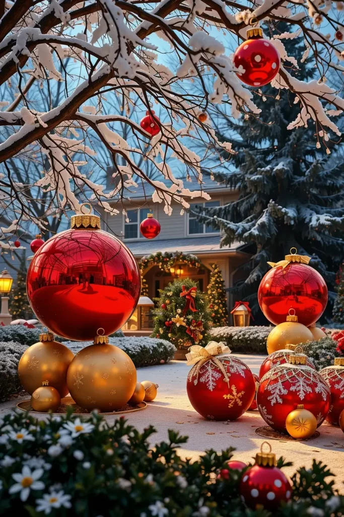 Another one of the strongest Christmas yard designer problems 2025 is the concept of over-sized ornaments being used in large numbers to provide a dramatic effect in the yard. I have noticed such huge balls, mostly of glossy red, gold, or silver, placed close to the entrance doors or under trees to create a strong impression. Their size provides immediate holiday glitz without necessarily being scruffy.