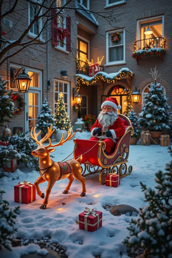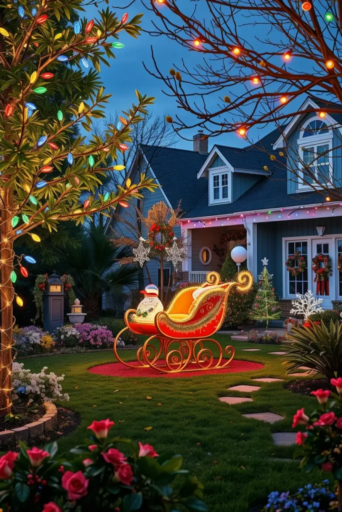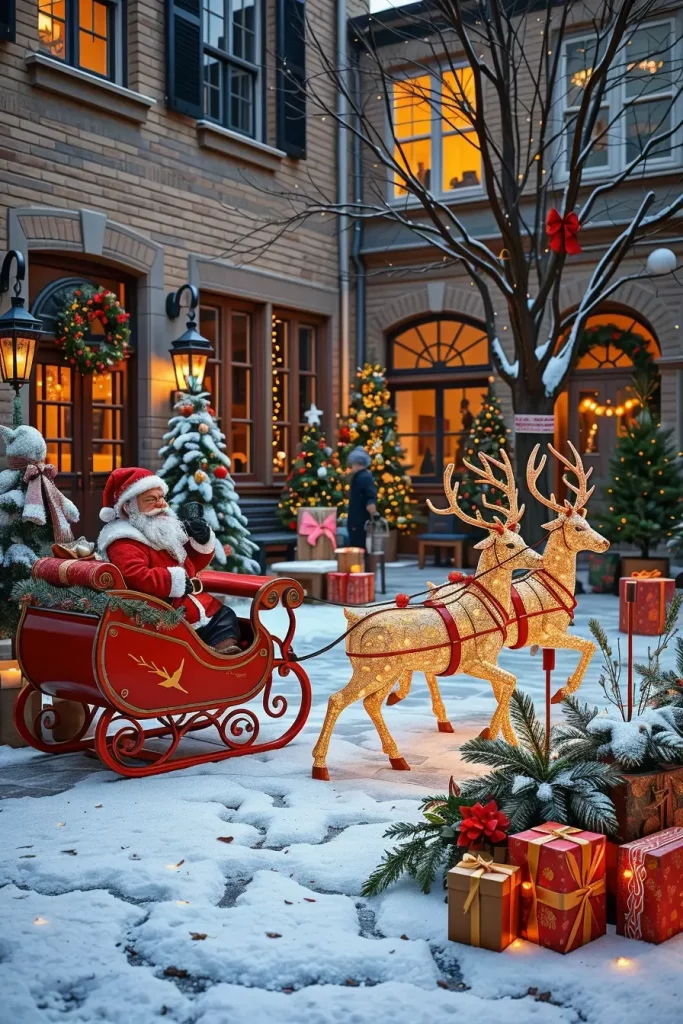 I have set up sleighs at the approachways, and on lawns. Pairs of a full sleigh with glowing reindeer are best combined, and laid slightly off-centre to give impression of motion. There are those with wooden or metal frames and I would always suggest to add LED accents to make them lively.