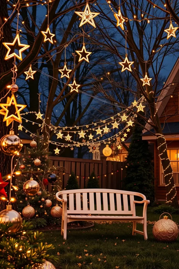 I like the combination of star-shaped LED lights with soft golden colors in order to provide coziness in the yard. As an illustration, bigger stars can be suspended over the main seating area whereas the small lights can be stitched into bushes or fences to carry the theme through the venue. They are balanced by simple furniture such as a white wooden bench which makes the whole set appear to be unified, contemporary and comfortable.
