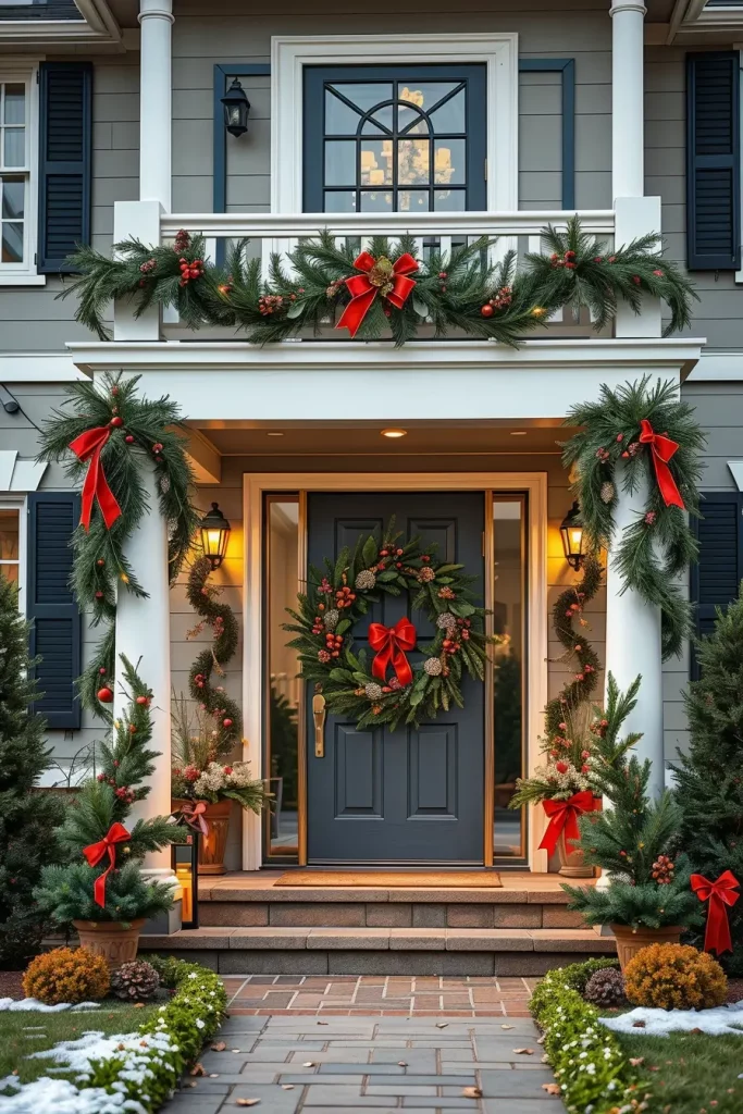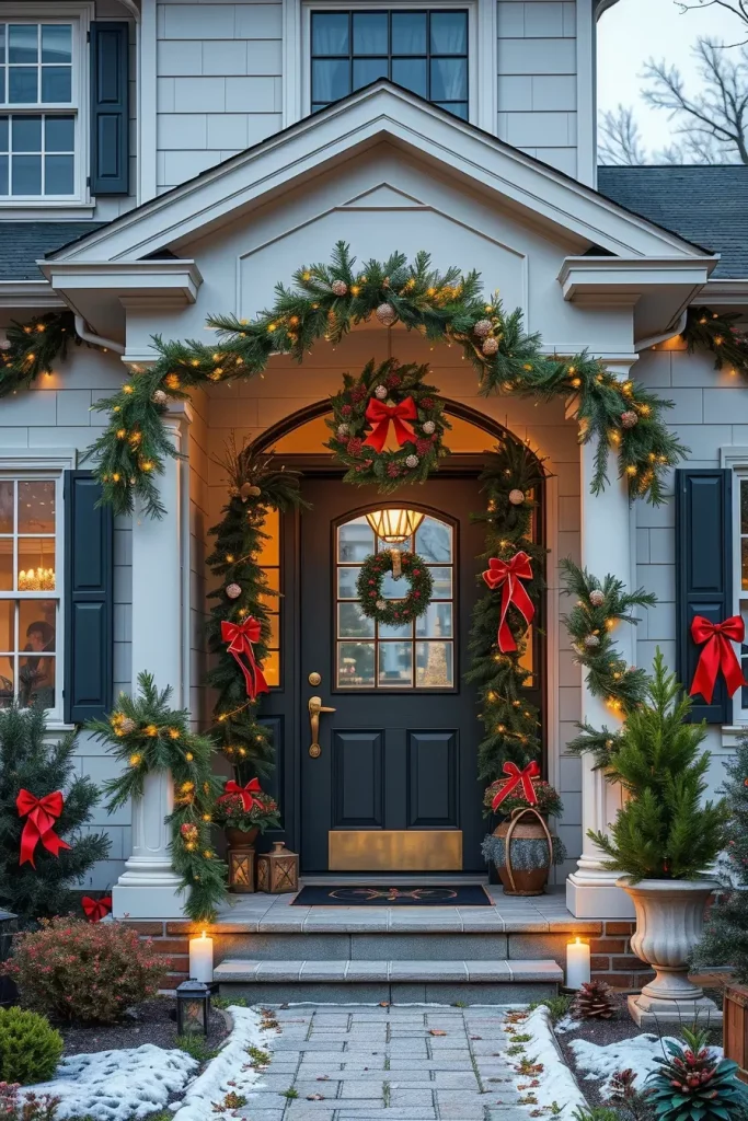 Personally, I am fond of huge potted evergreens encircled by twinkle lights to outline the steps at the doorway. Garlands added to the railing, bows on the door that are oversized all add to the atmosphere. In case the yard has a modern lighting, I take that similar style to the porches to make everything similar.
