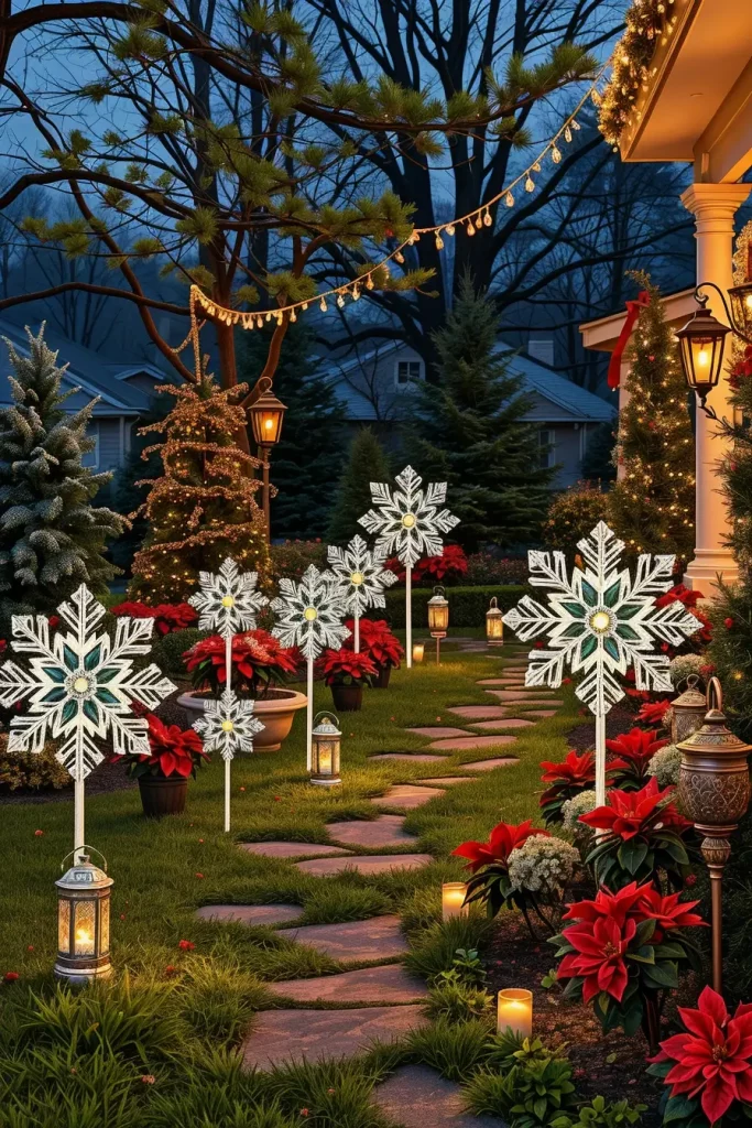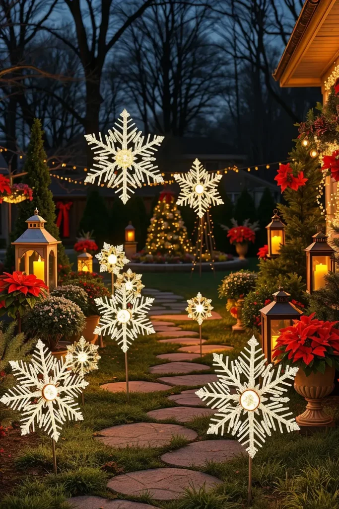 I prefer using wood, metal or even thick acrylic to make snowflakes shapes and paint them in white or silver. They can be made to look like a glittery show with the addition of glitter or in the case of LED lights attached to them, at night they are dazzling. I tend to arrange them on the garden walk or in the lawn to create an effect of a snowfall. They seem to be a perfect match with little lanterns or the poinsettia planters as well.