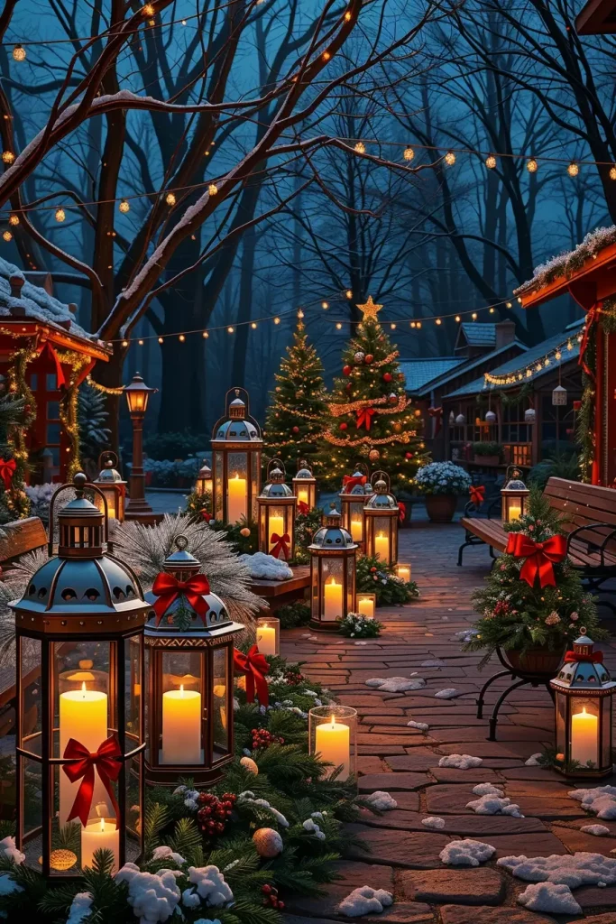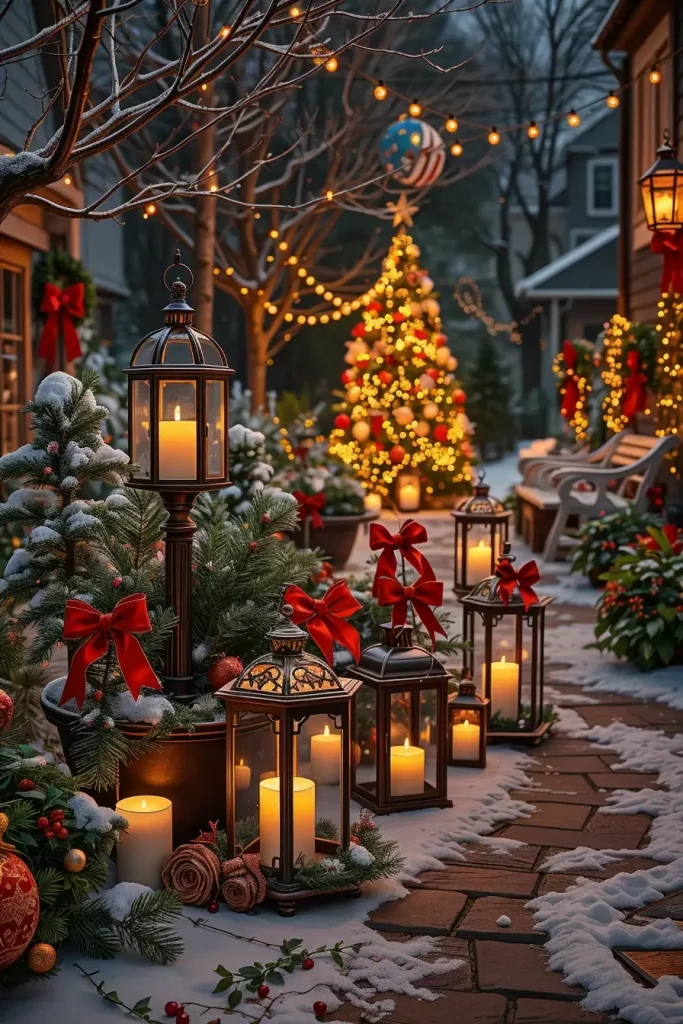 I would prefer to use lanterns of different sizes such as small ones that look like table tops and huge ones that stand on their own. They can be painted with pine sprigs, red bows or faux snow put in the house to provide festive appeal. Placing three lanterns in various heights together is a classy appearance, particularly when it is placed next to benches, staircases, or walkways.