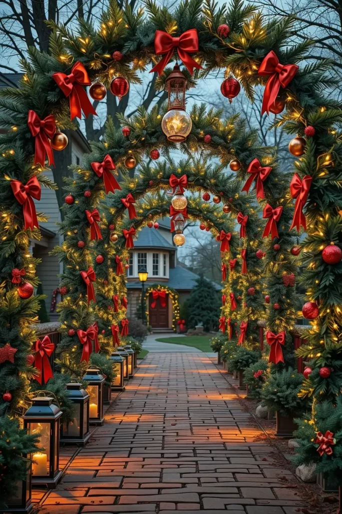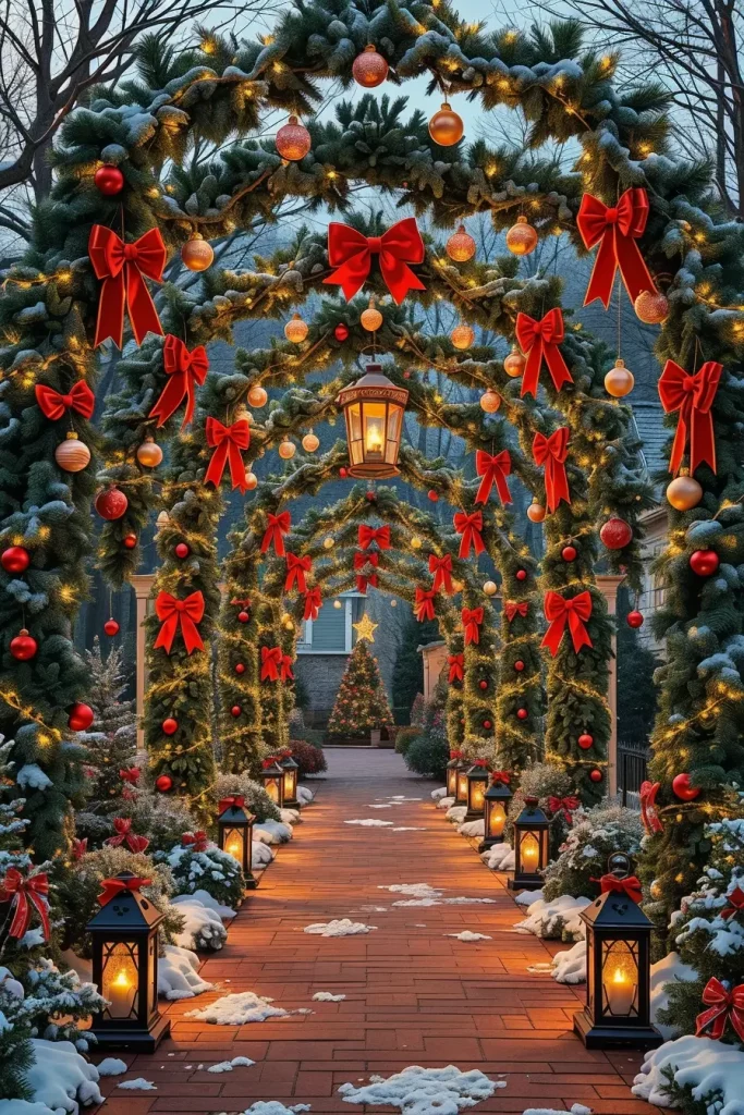 I usually put evergreen garlands on arches which are adorned with red bows, pinecones and LED fairy lights. They can be adorned with ornaments or snowflake decorations to be added that make them look even more like a holiday. The effect of several arches built along a walkway is a tunnel, which is magical and immersive.