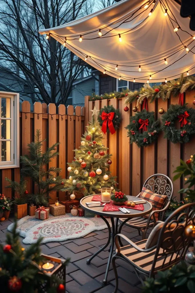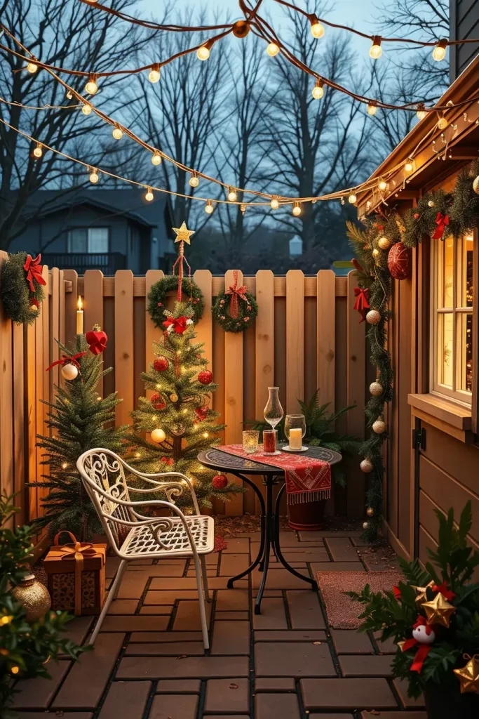 I would recommend a simple Christmas tree with LED lights, which is placed in a corner and therefore does not dominate. Wreaths and garlands hung on fences or walls will assist to clear the ground. In a small bistro set, festive table runners, lanterns or mini trees in a pot may be put up. Hanging fairy lights along a small yard even above the narrow one gives a sense of canopy and it is warm and charming.