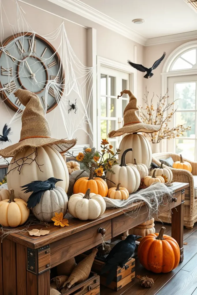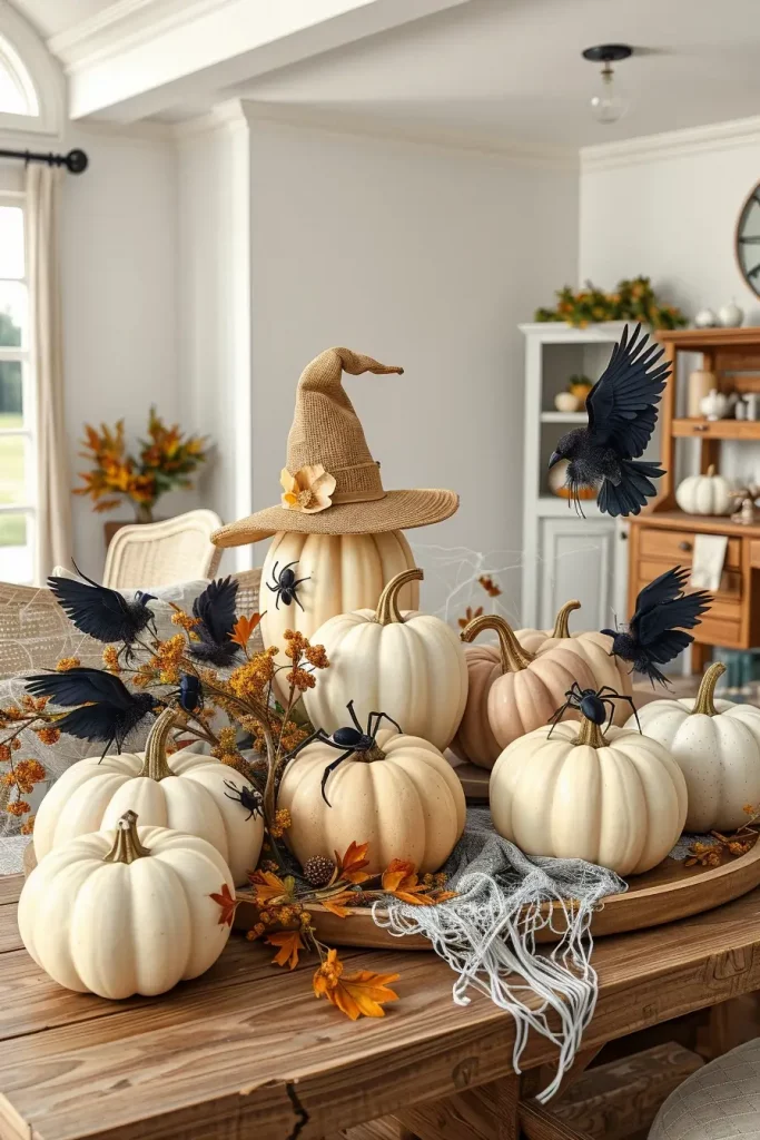 My fallback items are faux white cobwebs over a reclaimed wood hutch, burlap witch hats tacked over warm mantels, and cream-colored plush pumpkins in ticking-stripe baskets. I tend to sprinkle antique ceramic bowls with black spider cutouts and waxed crow feathers as contrast. These items will help you not to lose farmhouse style but enjoy the creepy atmosphere of Halloween in a slight manner.