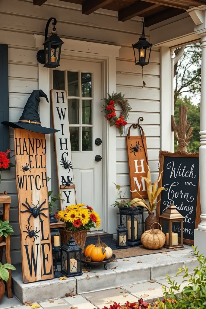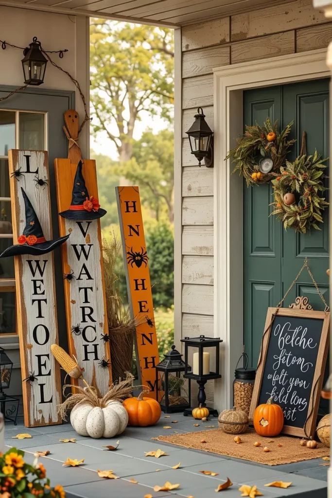 Such signs are complemented with old ladders, corn husks bundles, and a couple of hanging witch hats around. I have the signs leaning against the walls of the porch, fireplaces, or kitchen shelves so that I can style them flexibly. Extra credit: Carving wood bats or putting on little black decals of spiders to give it texture.
