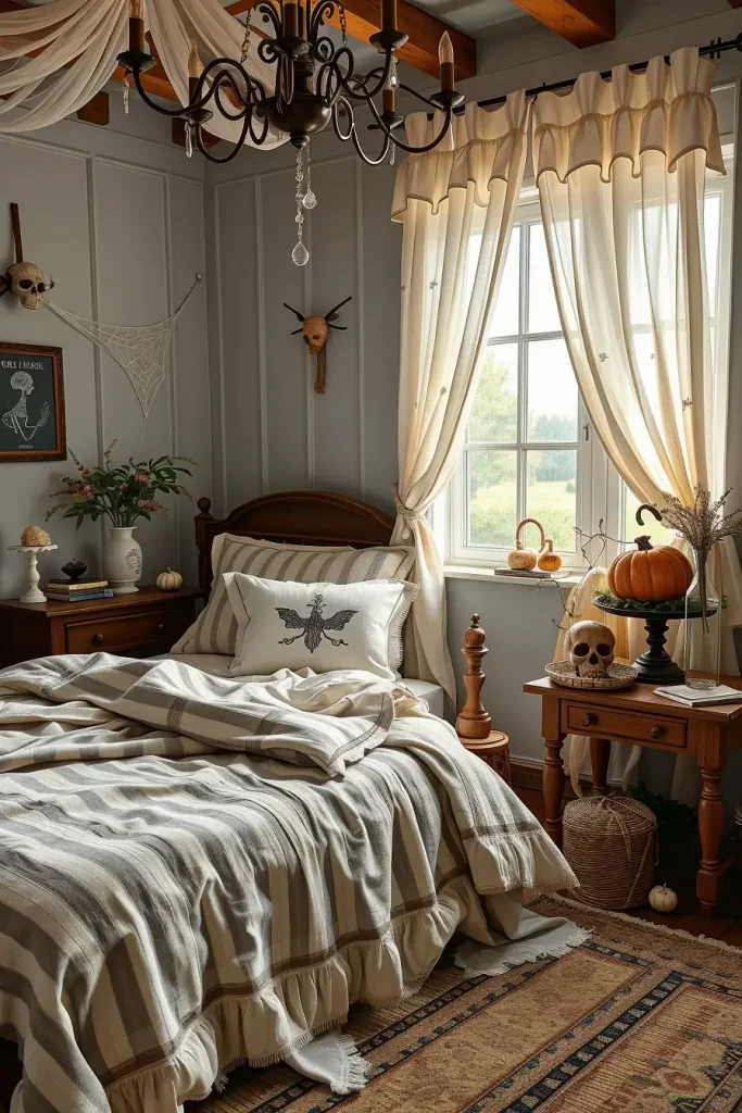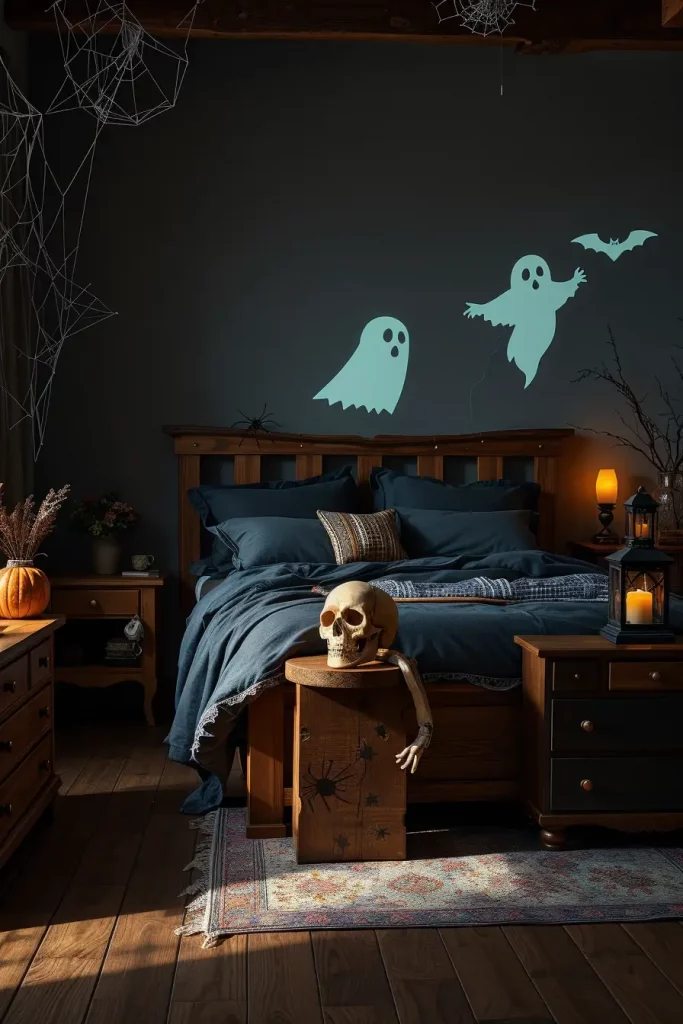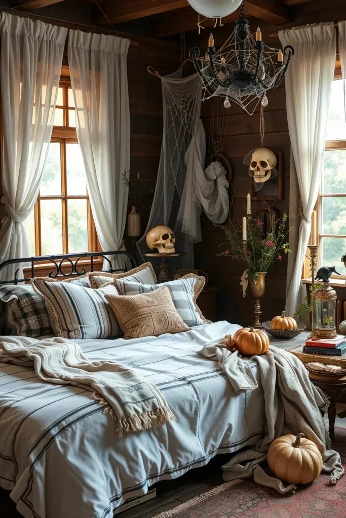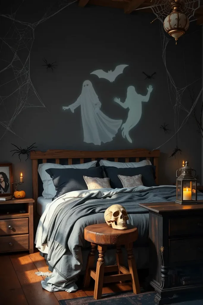 My farmhouse bedrooms are supposed to be restful and a little creepy in October, so I create a layered tonal scheme, charcoal linens, inky plaids, and raw wood, and then I add the tension of shadow-play graphics of a ghost, black bat, and crow projected on the wall with a simple clip lamp. The bed remains straightforward and cushy, yet the decoration around it turns theatrically sparse: a single skull on a bedside stool, an antique frame resting against the dresser, and a barely-there white cobweb hanging across the headboard. Cobweb textures are subtle and a couple of black spiders are included to keep it in the Halloween lane without destroying sleep-friendly serenity.