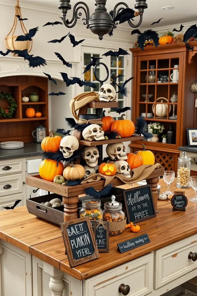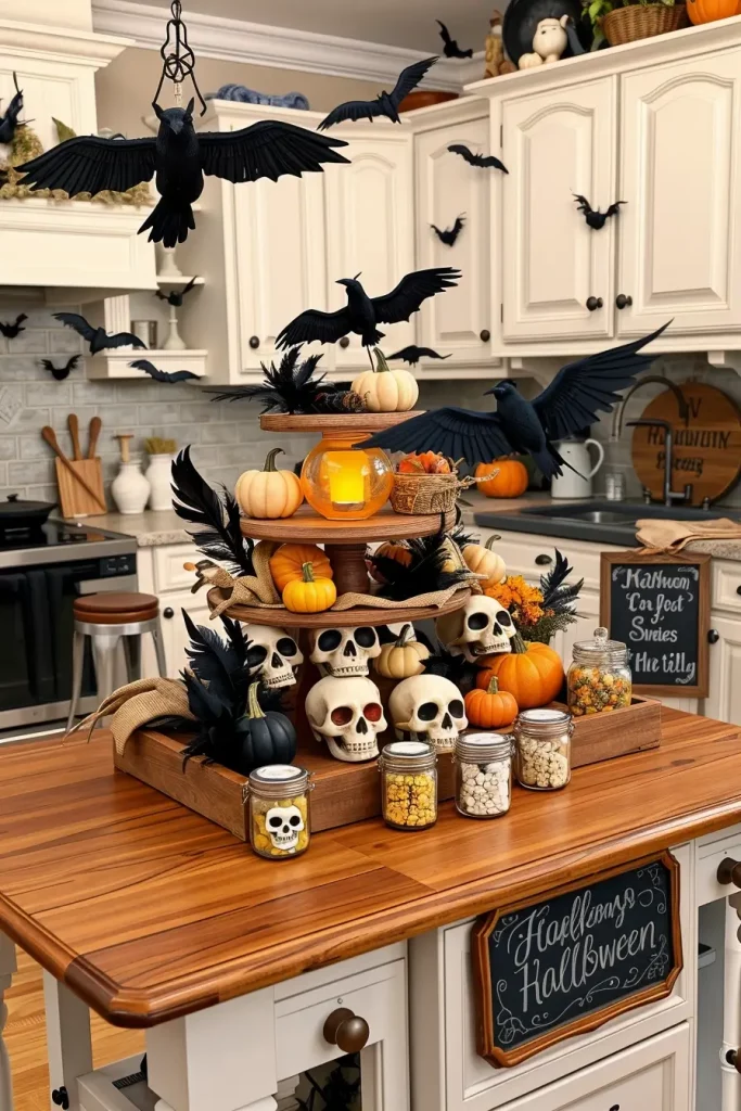 I have found that tiered trays are a conversation piece. I remember a trick of The Pioneer Woman: she recommends to change treats every week during the Halloween season, it will make the decor look new and engaging. I have used that and introduced weekly themes such as Crow Caf or Ghost Goodies.
