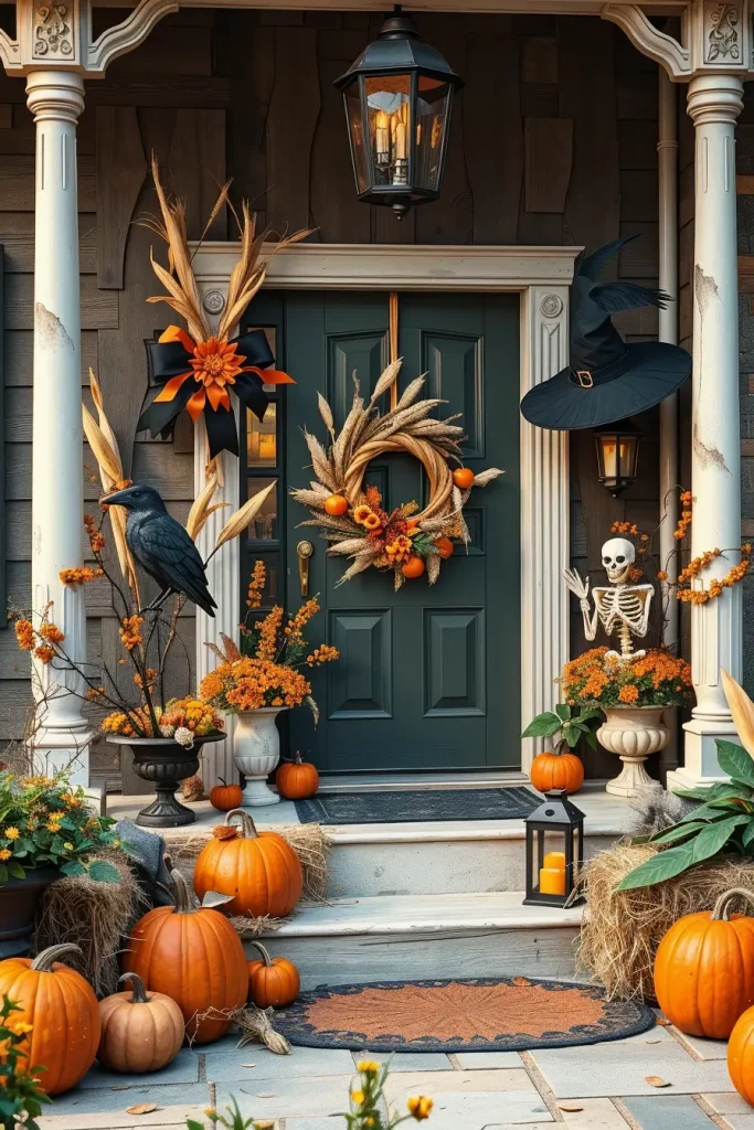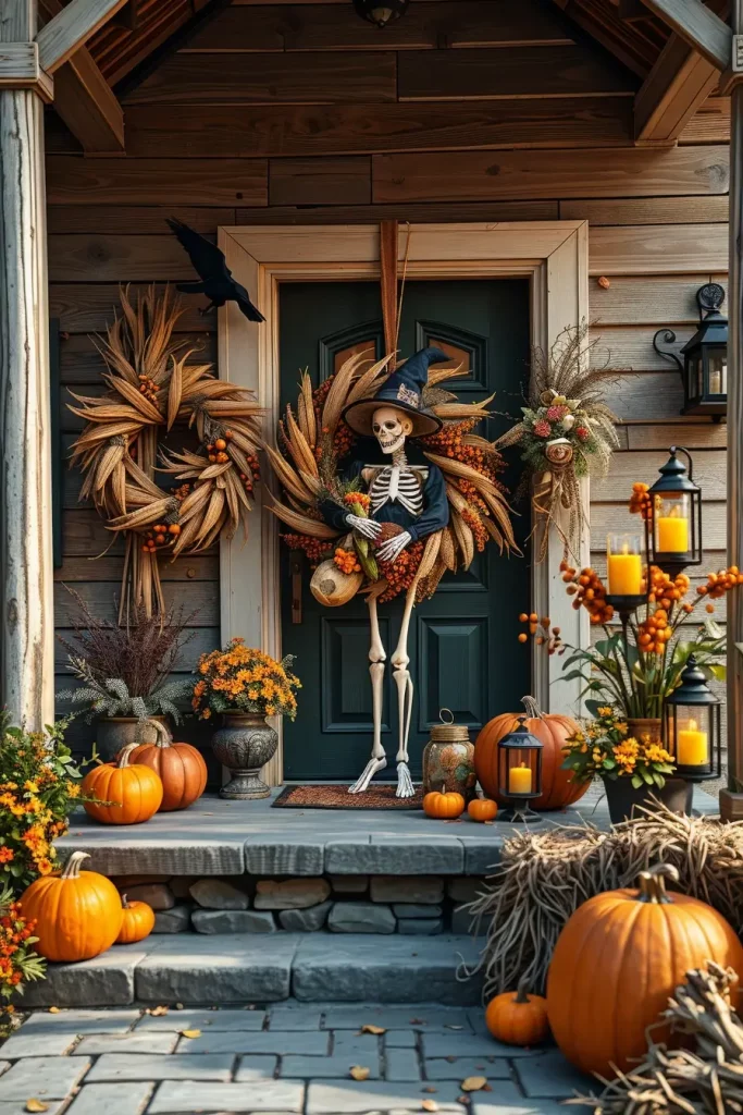 Any seasonal decor starts with the front porch, and in 2025, wreaths of dried materials in a farmhouse Halloween style are popular. I usually begin with a grapevine or wire foundation, and I add in dried corn stalks, mini white pumpkins, black feathers, and preserved eucalyptus. These wreaths combine country texture and eerie beauty.