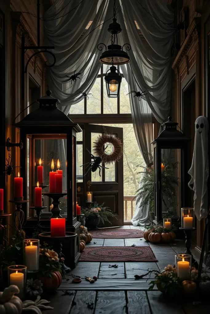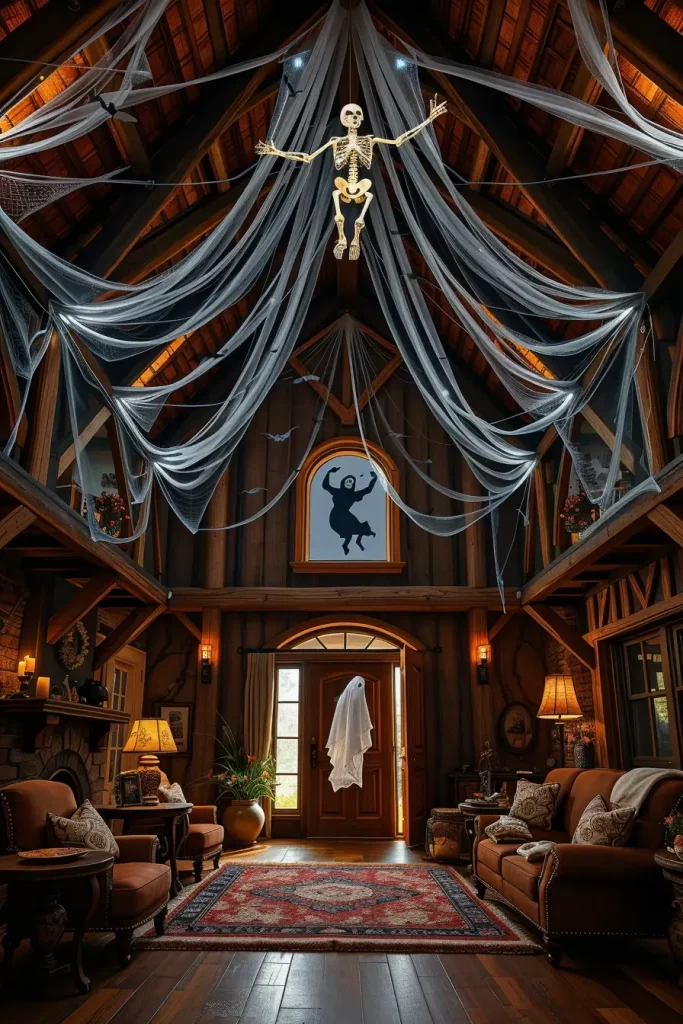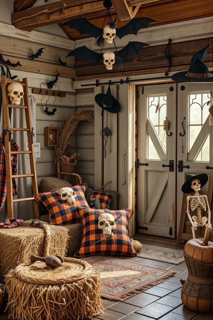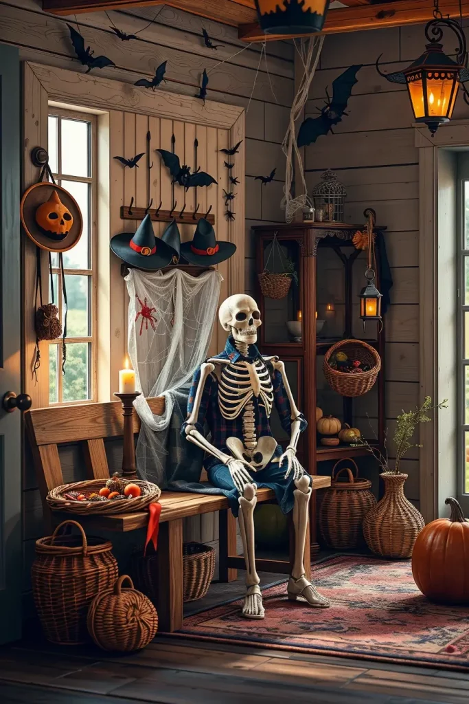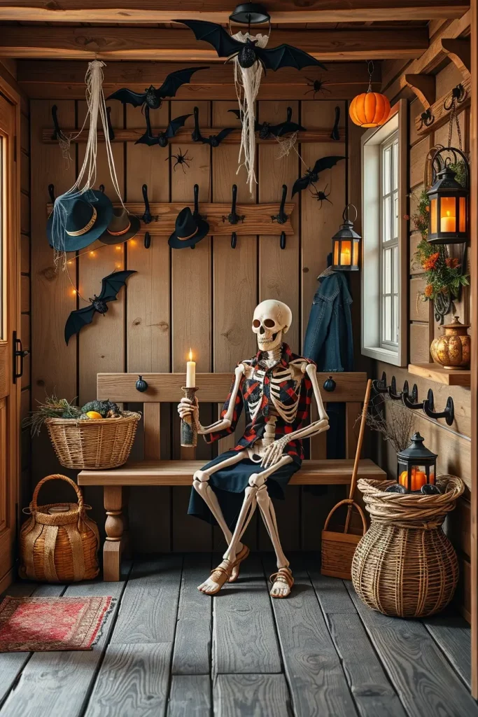 I am always convinced that the mudroom or the entryway can establish the mood of the whole house, particularly in the Halloween season. In 2025, you can make a skeleton welcome station in your farmhouse entry to give that instant mixture of welcome and horror. I prefer to match weathered whitewashed benches with old fashioned hooks with witch hats, old fashioned woven baskets with faux bones and an old fashioned coat rack with a black bat mobile. Subtle flickering candle with “blood” wax drips offer dramatic mood lighting.
