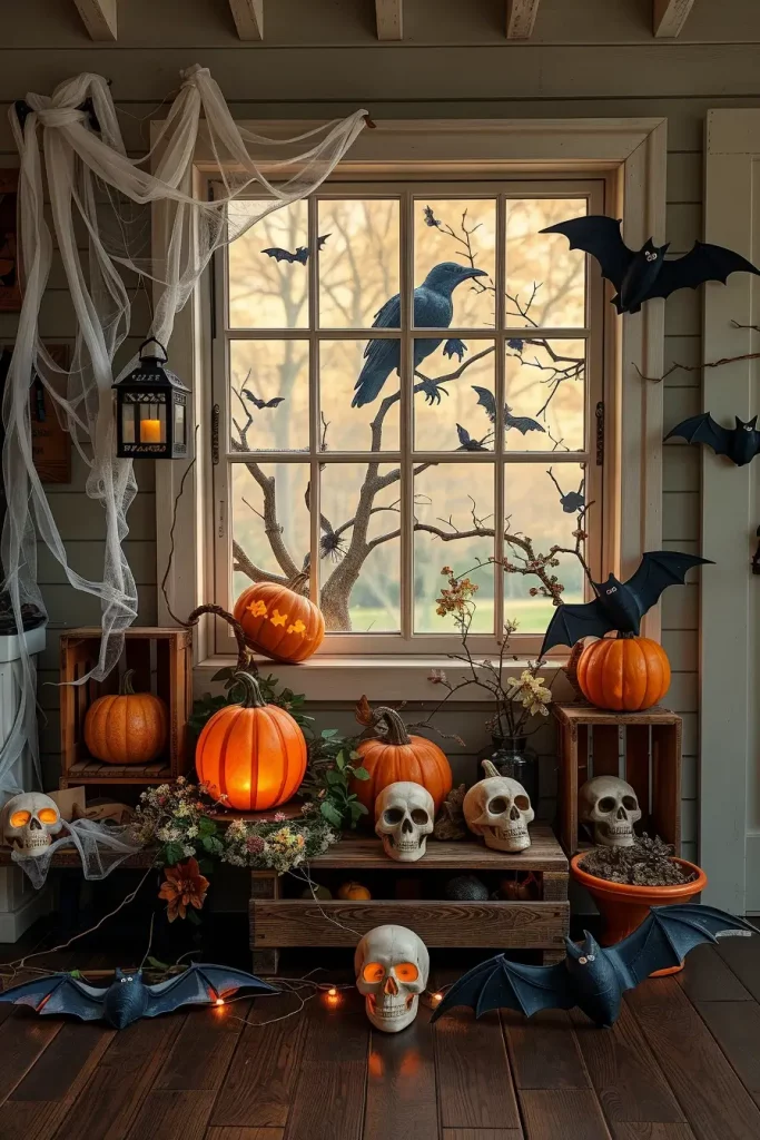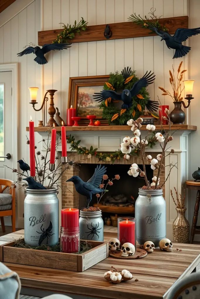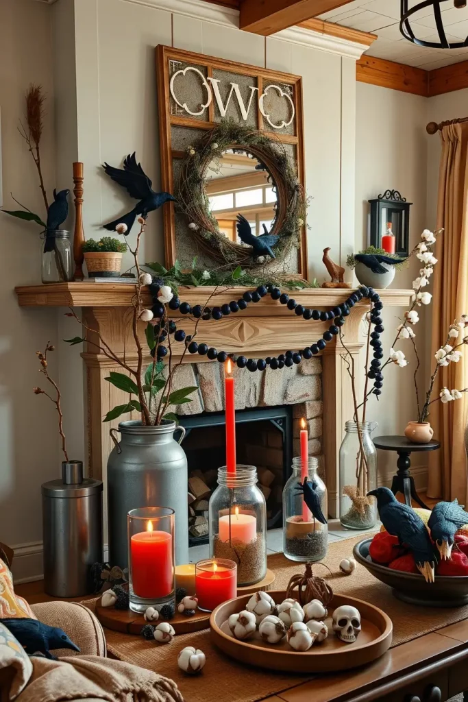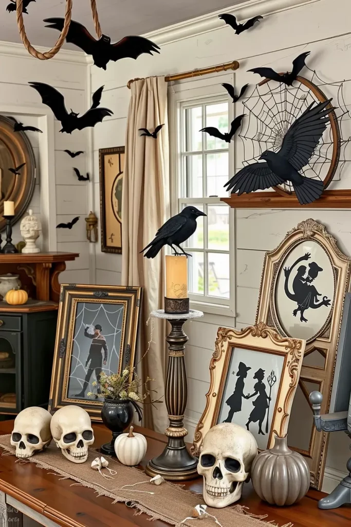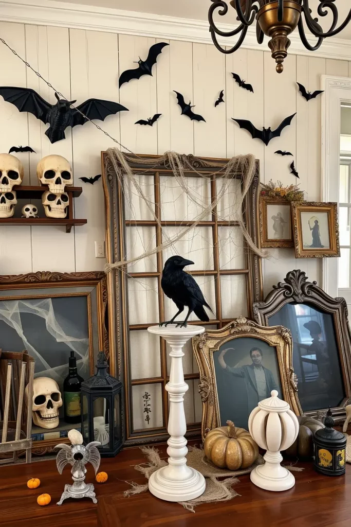 The mantel is the place where I am never minimalist, combining antique mirrors and chipped frames with kraft-paper bats that seem to fly up to the ceiling. A dominant central mirror cracked (or faux-cracked) creates a dramatic focal point, with a skeleton hand “reaching out” from a frame. I drape white cobweb and place candle with “blood” tapers at varying heights to get moody reflections. The farmhouse creepiness is characterized by tiny skulls hidden between the old books, a crow perched on the ledge, and an old doll silhouette hanging.