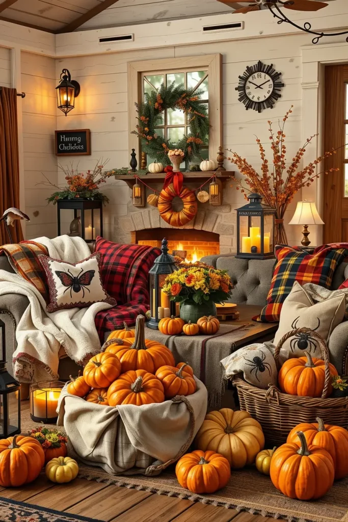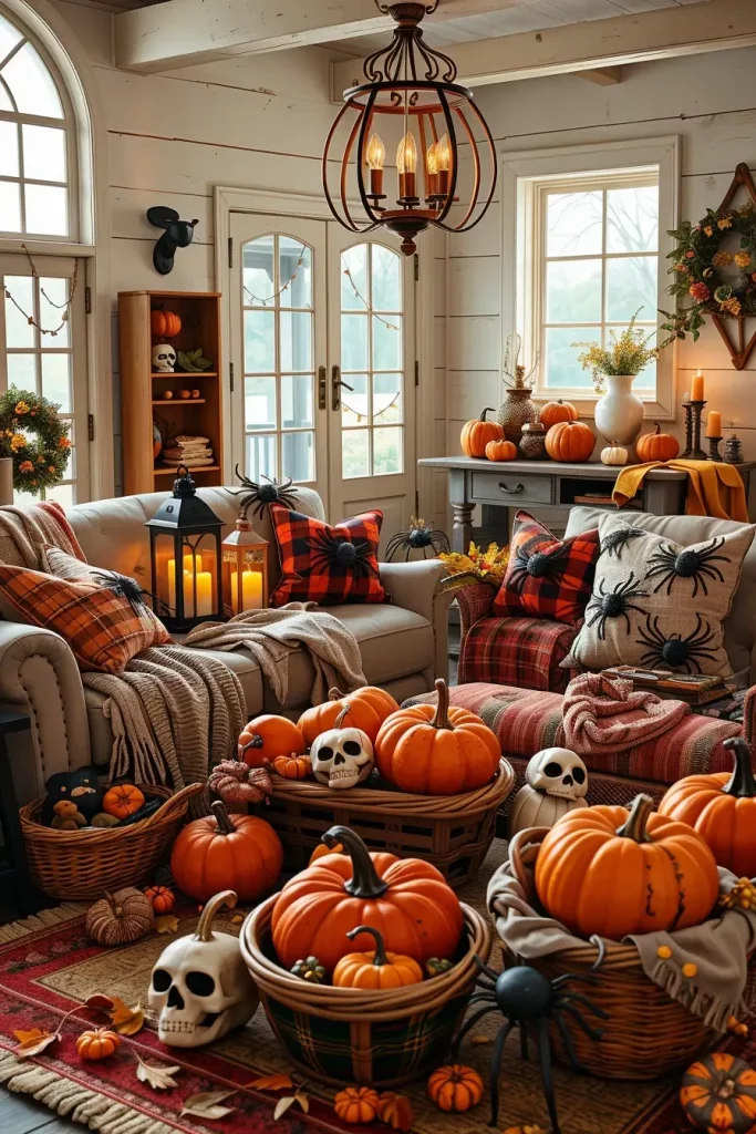 To style, I place pumpkin lanterns and old metal buckets with black spiders, leaves, and antique books around. The cozy farmhouse look is completed with a big floor basket of mixed plush and real pumpkins. I usually put little secret skeleton hands or skull charms between the pillows as a surprise.