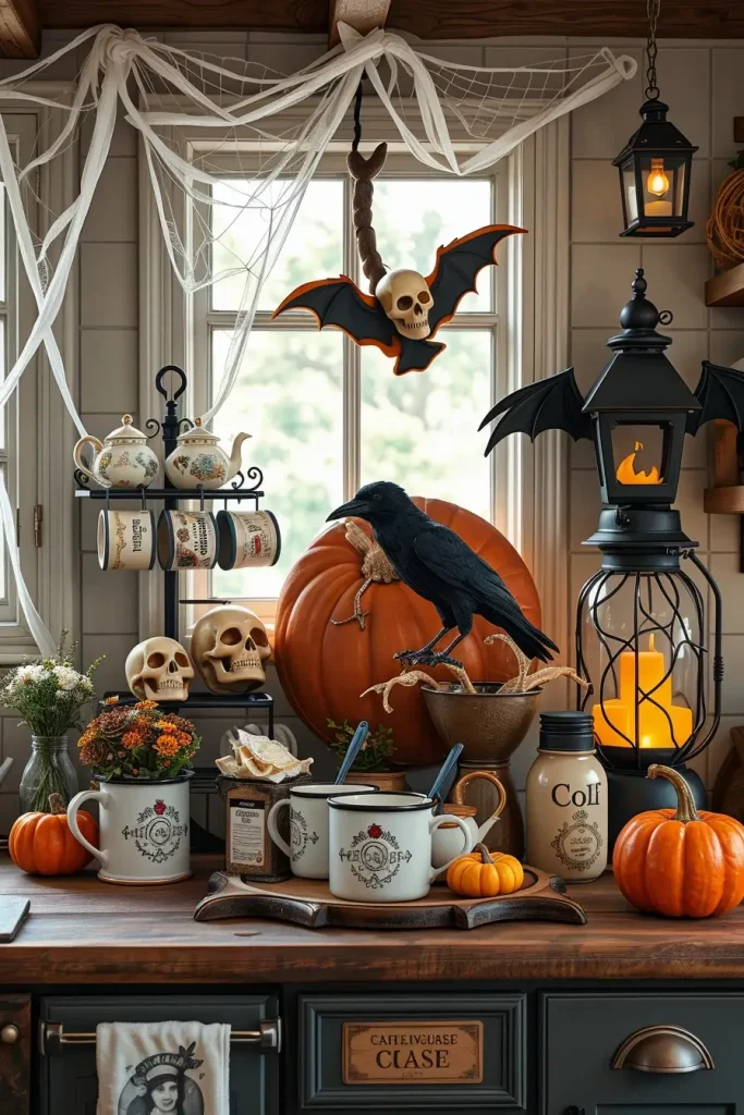 The kitchen coffee nook is a place that is visited the most in the house, and therefore, it is a good place to seasonally style. I turn mine into a spooky farmhouse every October with spooky farmhouse details that are a bit playful yet refined. I wrap shelves in light gauze or linen to resemble white cobwebs and I place inside enamel mugs, skull-shaped creamers, and spice jars with labels such as Bat Brew or Witchs Mocha.