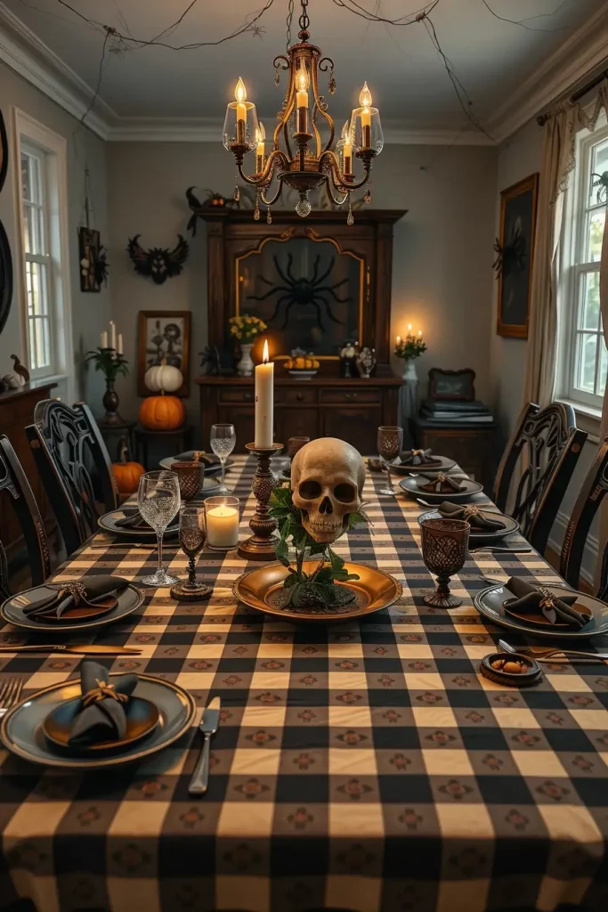 The farmhouse table is where you can combine comfort with horror. I begin with a plain gingham tablecloth, which is normally black and beige, to add a country feel. Then I layer in Gothic-style silverware, black chargers, and taper candle with “blood” wax finishes for elegance and drama. It works because of the contrast of clean country gingham and haunting elements.