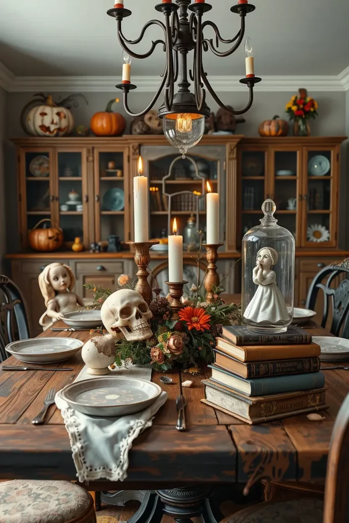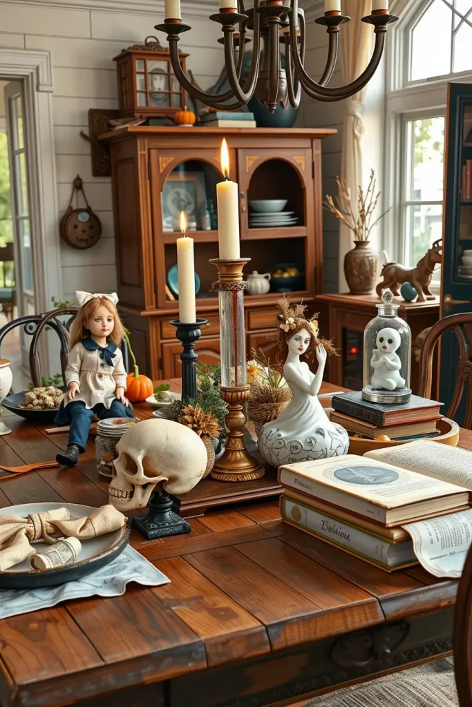 Being a fan of recycling old gems, Halloween is the best season to visit thrift stores. I always start by sourcing antique bowls, rusty candleholders, cracked porcelain dolls (think old doll), and yellowed books. I use these discoveries as the core of my creepy DIY centerpieces, which are great on dining tables or entry consoles.