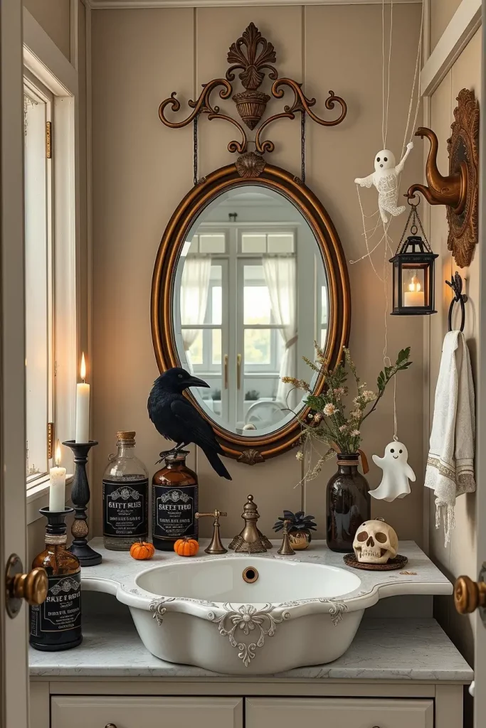 I go all old pharmacy in the bathroom to achieve the farmhouse-meets-Halloween effect. I decant my daily necessities, cotton balls, bath salts, and Q-tips, into old apothecary jars with old black labels that say things like Bone Dust or Witch Tonic. There are some mini skull toppers, a crow sitting on a branch, and small figures of black spiders on the frame of the vanity mirror to give the right amount of evil appeal. A faded linen curtain, aged bronze mirror, and candle with “blood” effect taper set the scene.