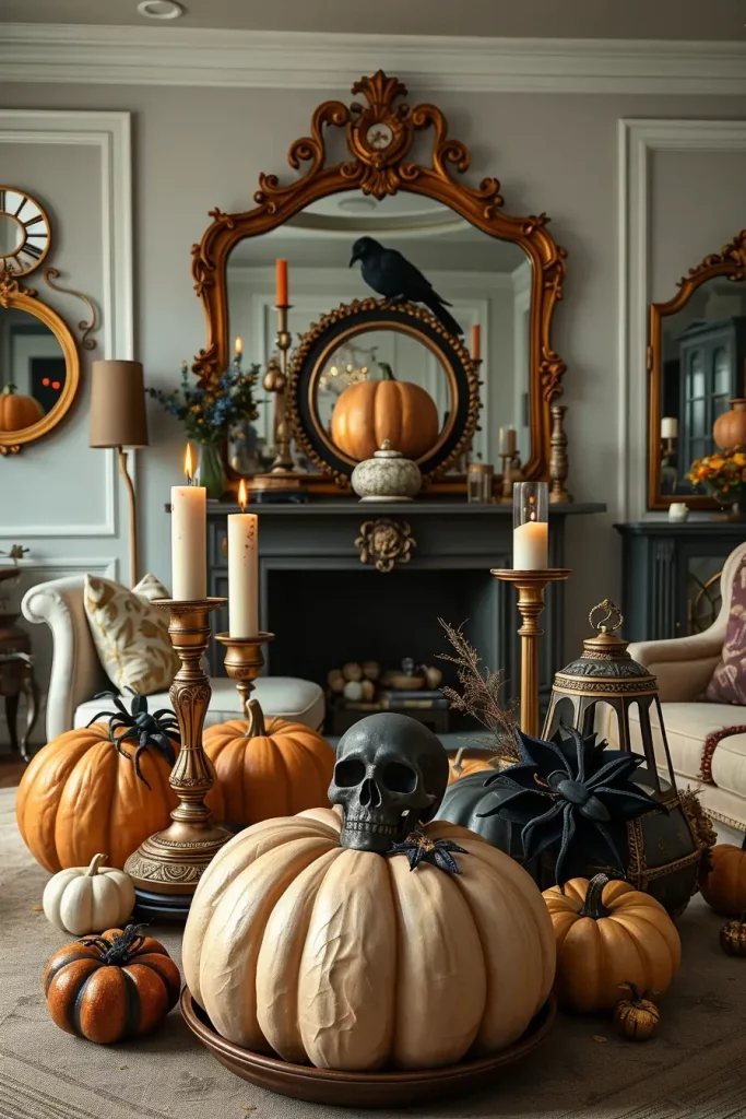 I would still include velvet ribbon bat garlands or velvet covered books on the coffee table to repeat the pumpkins and tie the scheme together.