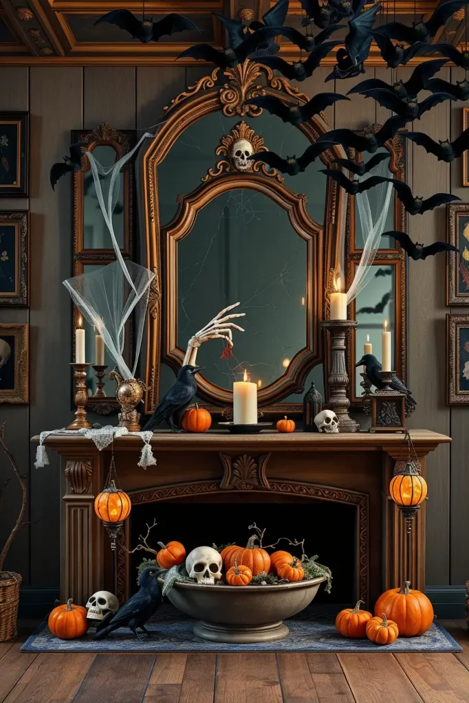 Halloween Mantel Styling: Layered Mirrors, Frames, And Bats