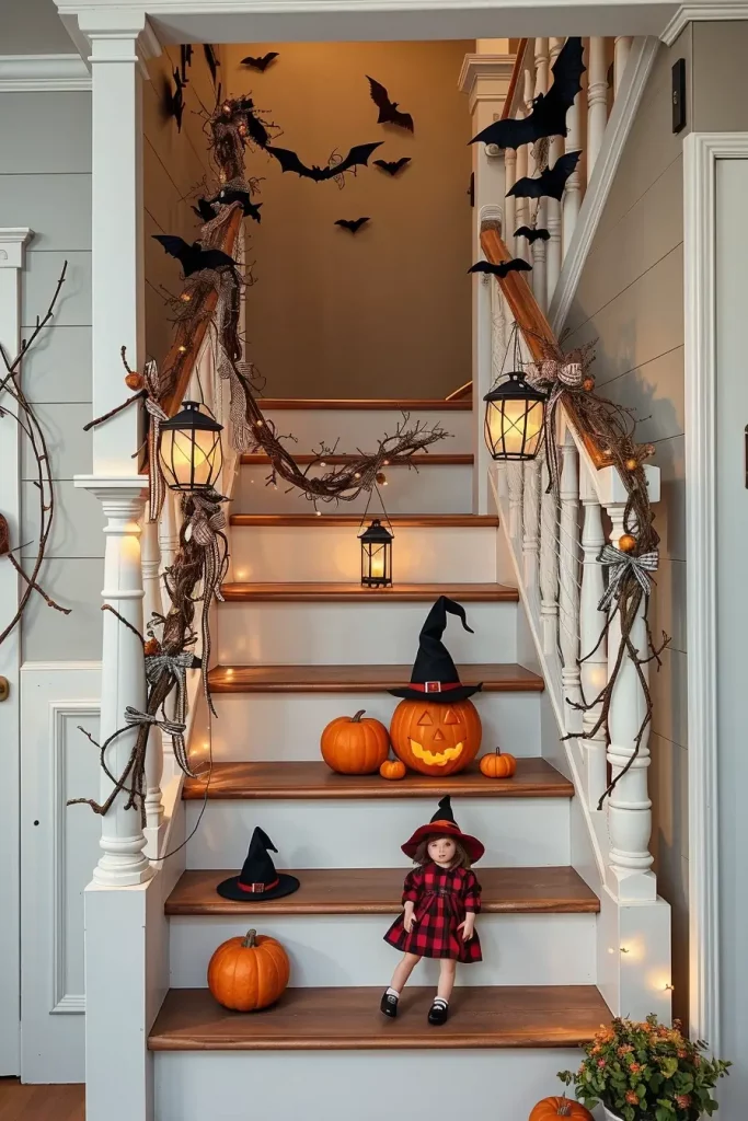 Staircase Garlands With Twigs, Bats, Ribbons, And String Lights