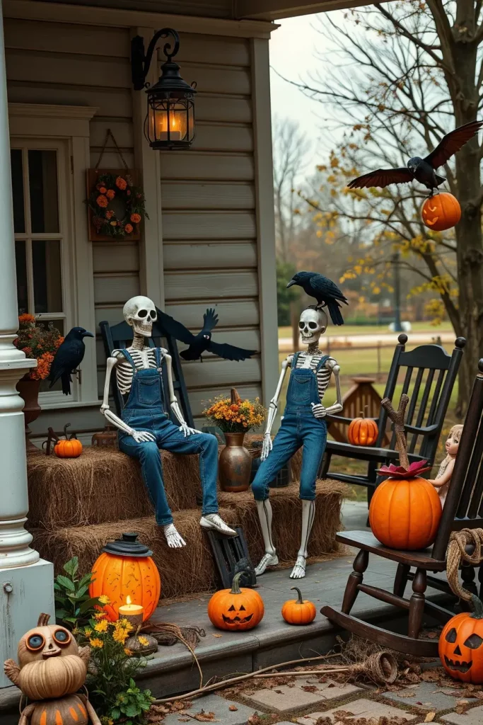 This concept is always funny-and full of photo opportunities. I clothe life-size skeletons in denim overalls, flannel shirts and old boots, and pose them in sitting positions on hay bales or rocking chairs. It is a saucy blend of laughs and fright that fits well on a farmhouse porch or foyer.