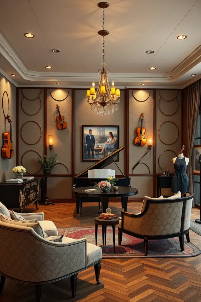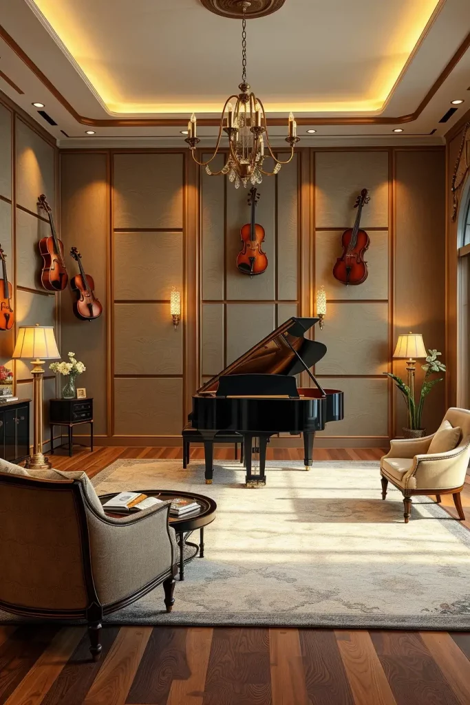 The design includes wall-mounted instrument storage along with digital or upright piano placement as the main feature and combines area rugs with acoustic panels for sound control. The music session becomes more comfortable when you add a small couch or bench. Recessed lighting pairs with dimmer switches to generate the ideal mood which supports composition or relaxation. The combination of hardwood flooring produces excellent sound resonance without losing visual clarity.