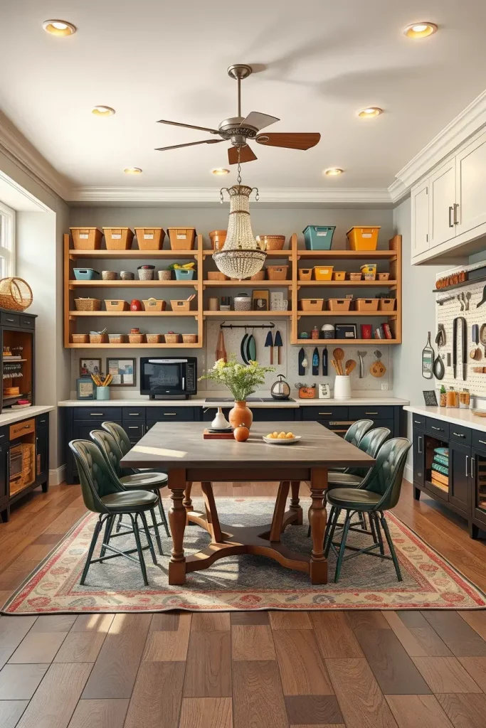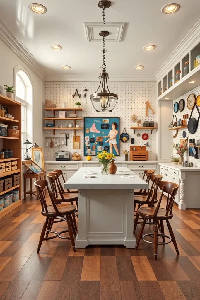 The central element in my designed rooms includes adjustable worktables that can be extended or raised to different heights. Open shelving together with modular storage cabinets should be present for supply organization while sufficient overhead and task lighting ensures functional space usage. The setup becomes adaptable and inspiring through the use of pegboards for tool hanging and pull-out bins and a rolling cart.