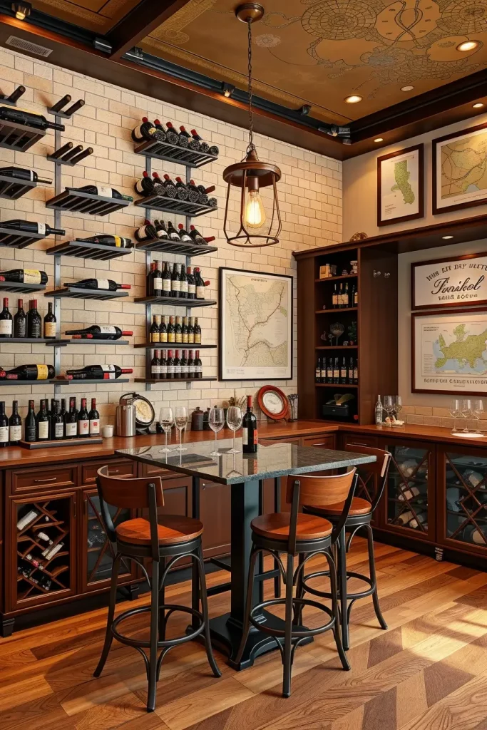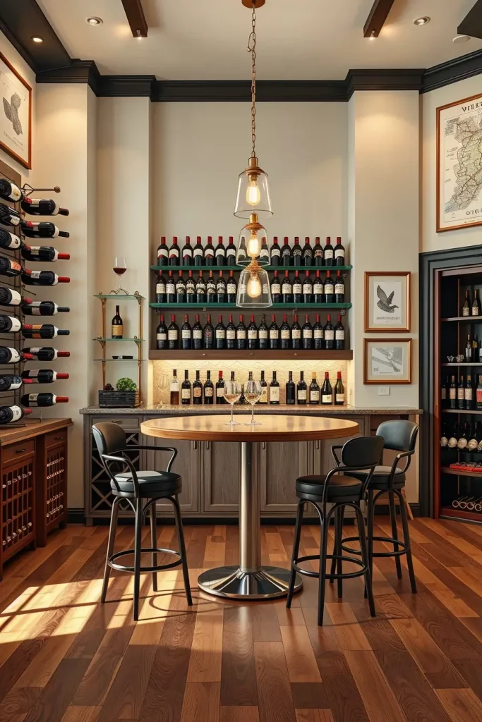 The design features a tasting table or island that includes integrated wine refrigeration units below. Vertical wine racks installed on walls together with glass-fronted cabinets combine wine storage with decorative elements. The installation of dimmable pendant lighting systems generates romance in the space yet stools with high backs produce an elevated enjoyment level. The room receives its vineyard theme through the combination of earth-toned paint and stone accents.