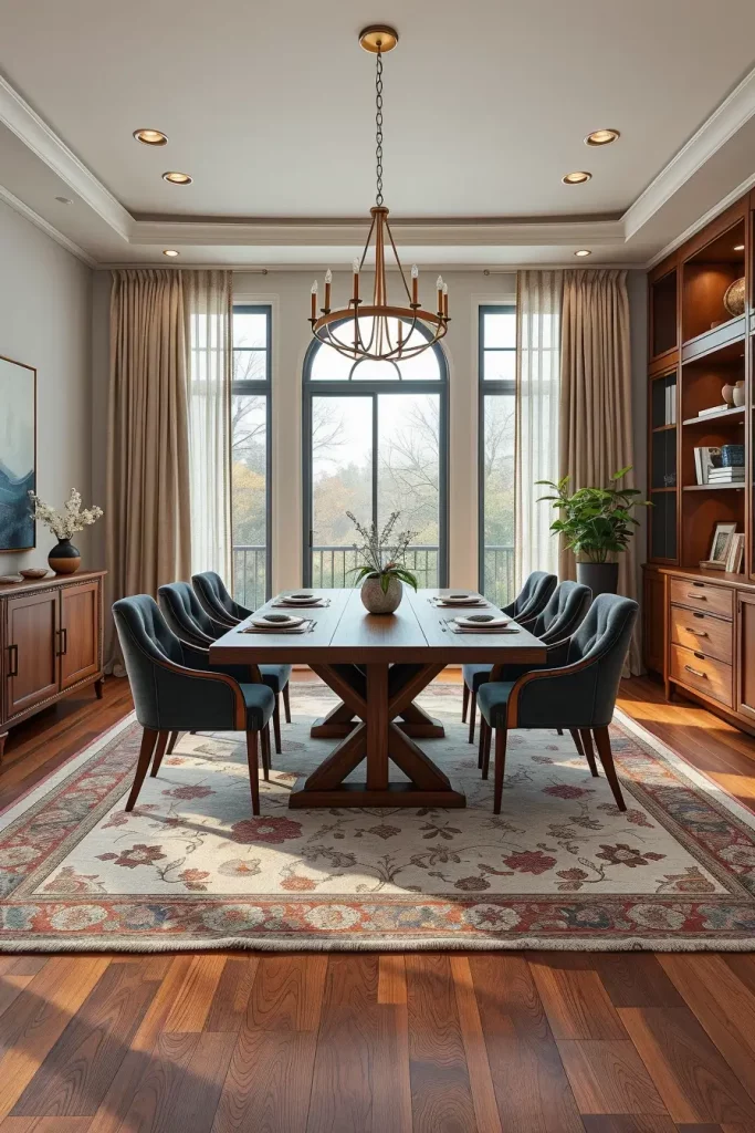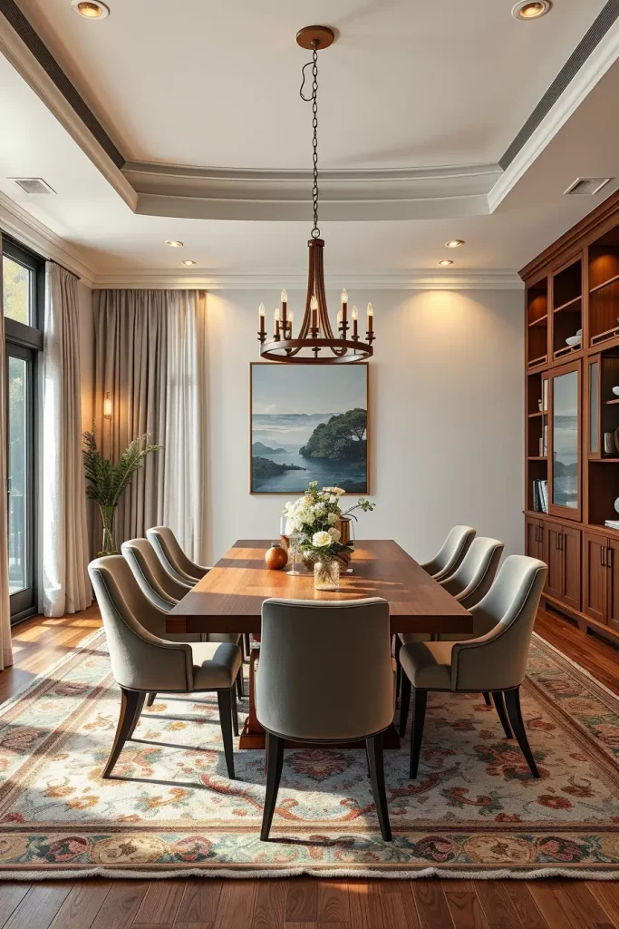 My typical choice for a dining table is walnut or oak with plush upholstered chairs using soft velvet materials. The combination of an area rug with texture and linen curtains and metallic lighting fixtures finishes the design. The design receives its anchor from wall decorations that include woven textile panels and framed fabric art pieces. All my designs contain LED lighting with adjustable dimming capabilities.