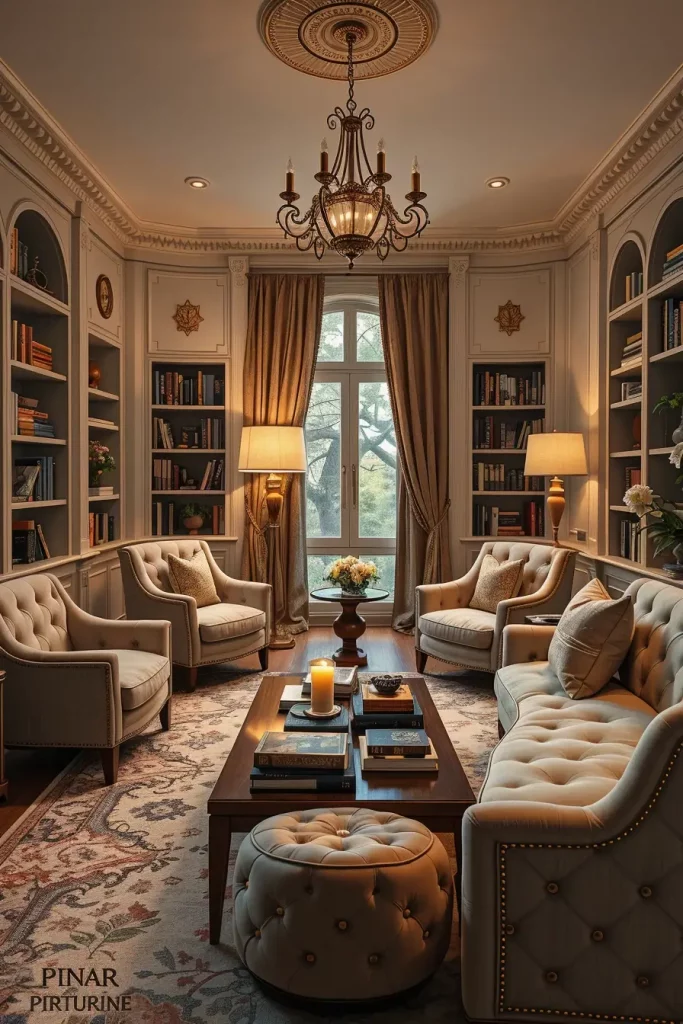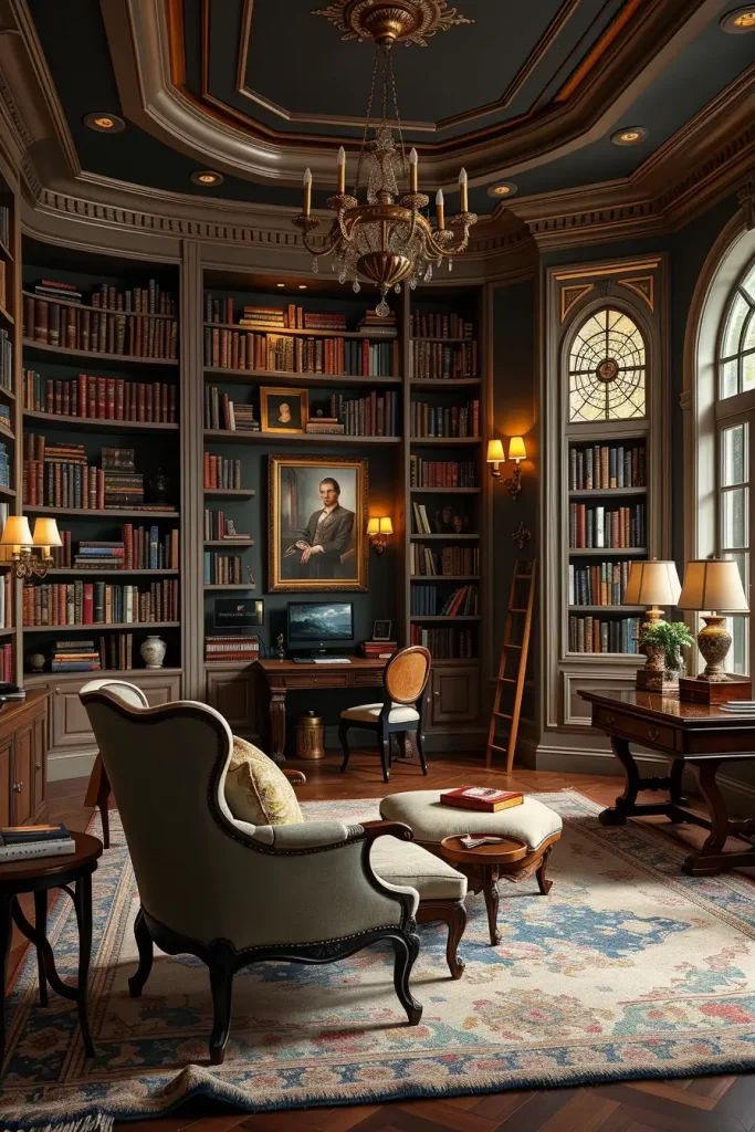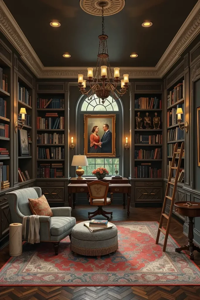 The design includes bookshelves reaching from floor to ceiling installed on one or two walls and features club chairs or a tufted loveseat in the center space. A combination of overhead chandeliers with seating lights and shelf illumination provides functional as well as aesthetic enhancement to the space. Navy and forest green together with charcoal gray produce an elegant atmosphere in interior spaces.