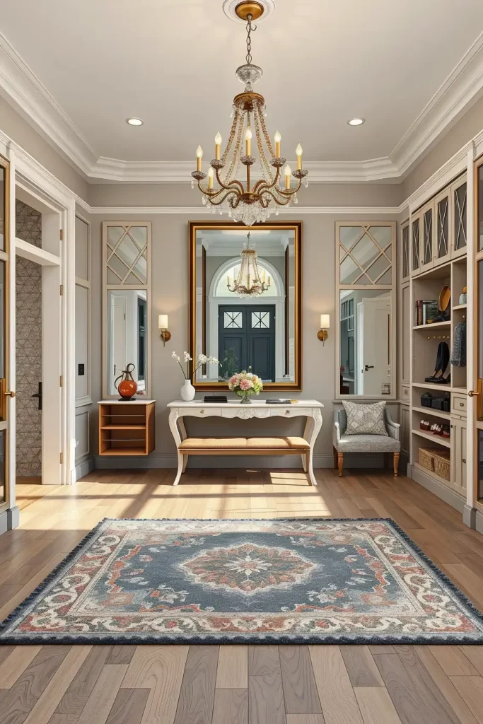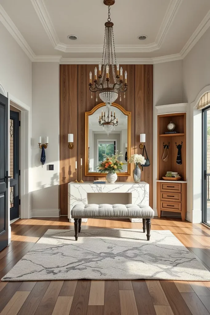 The first step should involve a console table that makes a statement with wood or marble elements. A large piece of art or a frame surrounding a mirror positioned above the door will help expand the space further. Built-in shoe cabinets and wall hooks and upholstered benches with concealed storage should be added to the design. The space maintains its formal character while remaining inviting because of its chandelier or pendant lighting fixture.