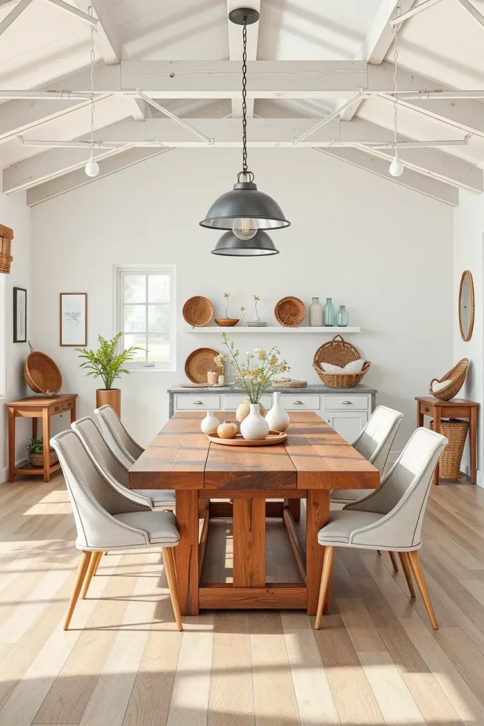 A dining table built from reclaimed wood should have tapered legs while slim-profile chairs should receive linen or cotton upholstery. The walls should remain white or dove gray while exposed wood beams can be installed if building structure permits. Complete the room design by adding a metal pendant lamp and wicker storage baskets and ceramic vases that serve as centerpiece holders.