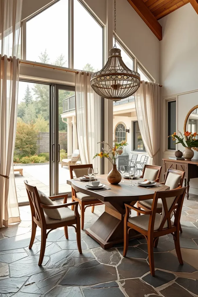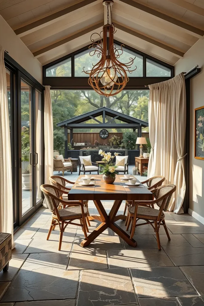 My choice of dining tables includes teak or metal frames with weather-proof finishes which bridge the look between indoor and outdoor elements. The design includes sheer curtains for softness together with stone or tile flooring and a statement chandelier that adopts natural shapes through branch or petal motifs.