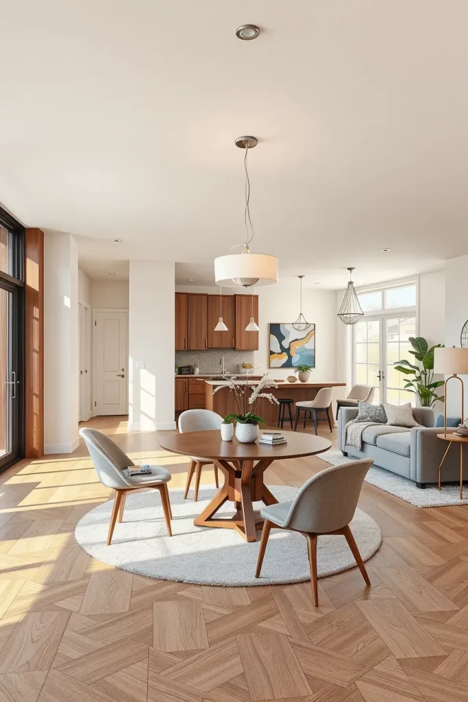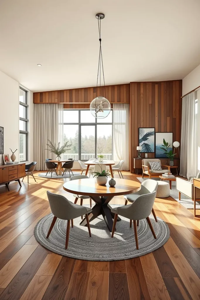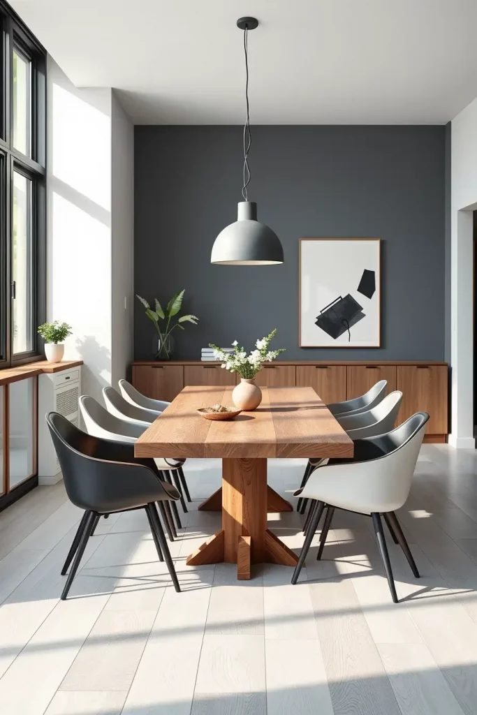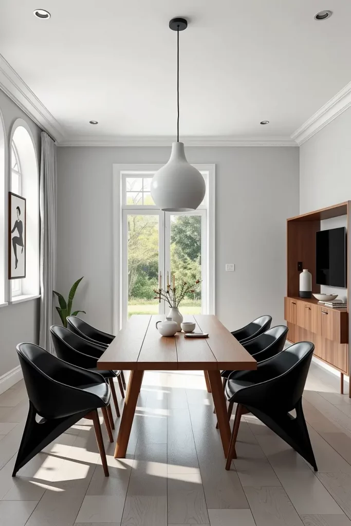 The design of this concept includes a rectangular table with light wood or matte black legs together with Scandinavian-style dining chairs. The floating buffet design offers sufficient storage space while keeping the room uncluttered. The use of abstract artwork along with monochromatic gallery walls serves instead of ordinary decor while track and recessed lighting systems maintain clean ceilings compared to chandeliers.