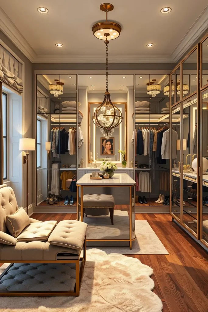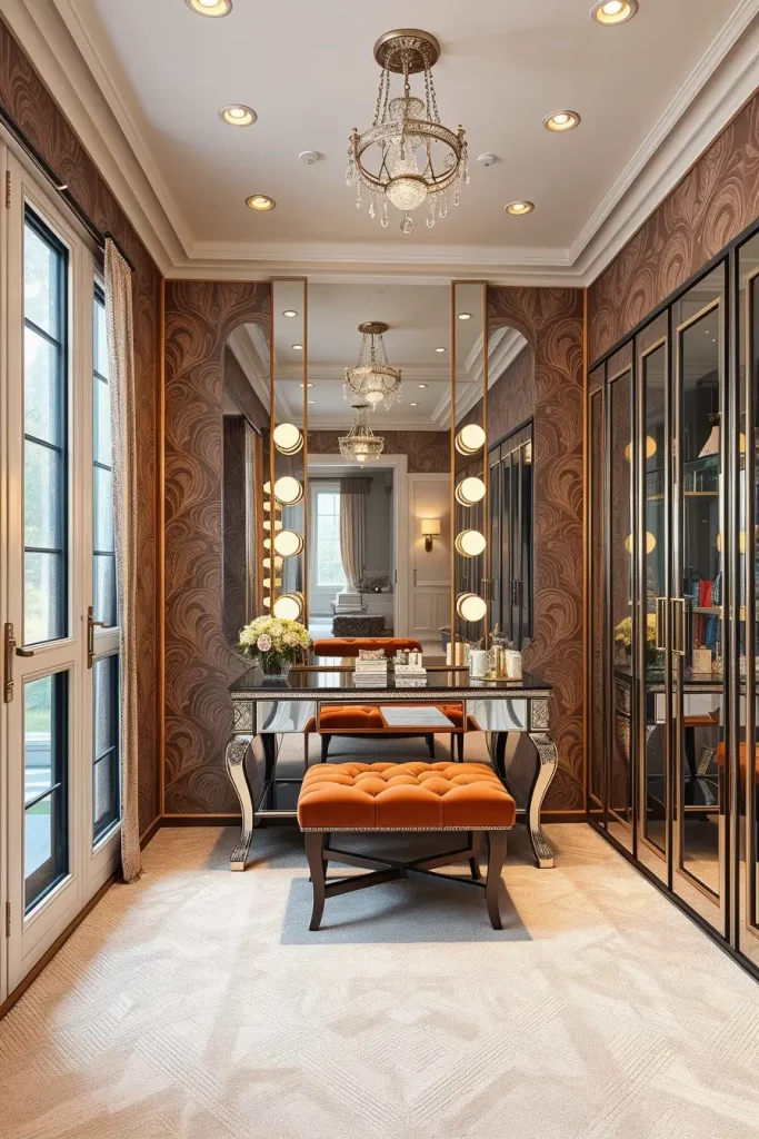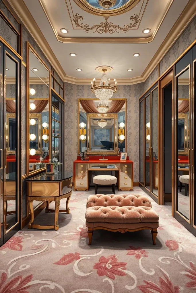 A vanity table with mirrored drawers stands as the main focal point. The walls should receive built-in wardrobe units featuring glass-front doors while a plush ottoman or bench should complement them together with a full-length mirror that includes backlighting. Velvet and lacquer and metal elements in silver and gold form the base of your design choice. Wallpapered ceilings can enhance drama.