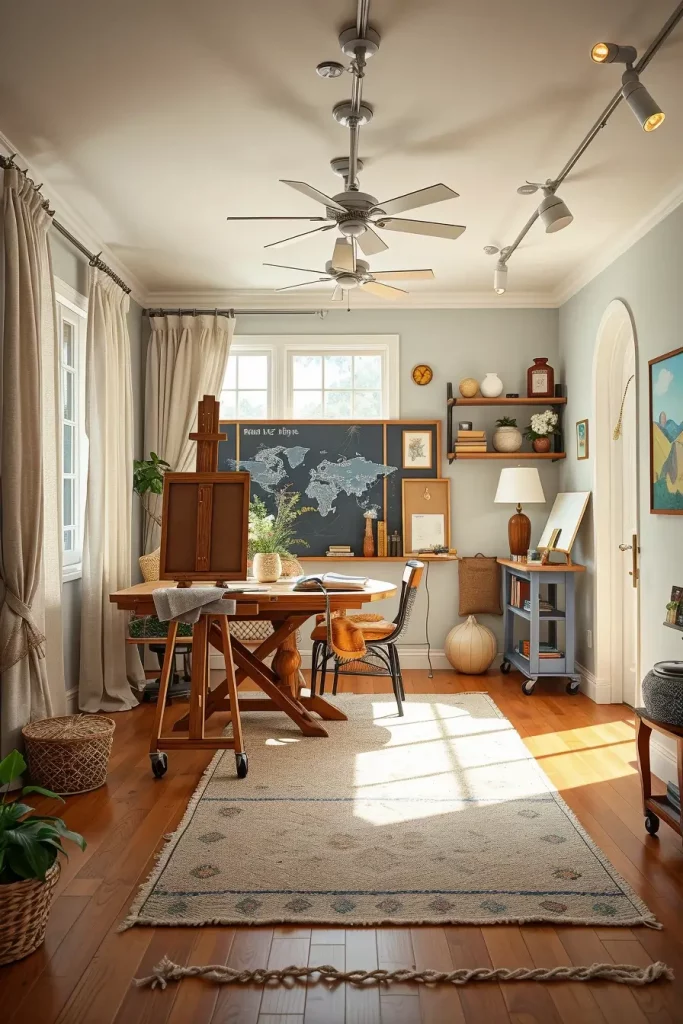 The studio begins with a standing easel and a drafting table and an art supplies cart that rolls. A mix of materials and completed works can be displayed on open shelves. The area will become more welcoming through my combination of linen drapes and wool floor coverings and a corkboard mounted on the wall for displaying mood boards. The retention of formal room characteristics is possible through the use of a narrow console table and framing tools. The wall should be painted with relaxing colors such as soft gray or muted sage.