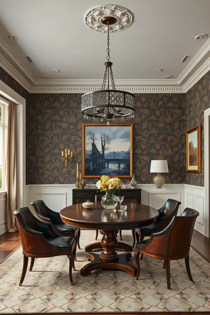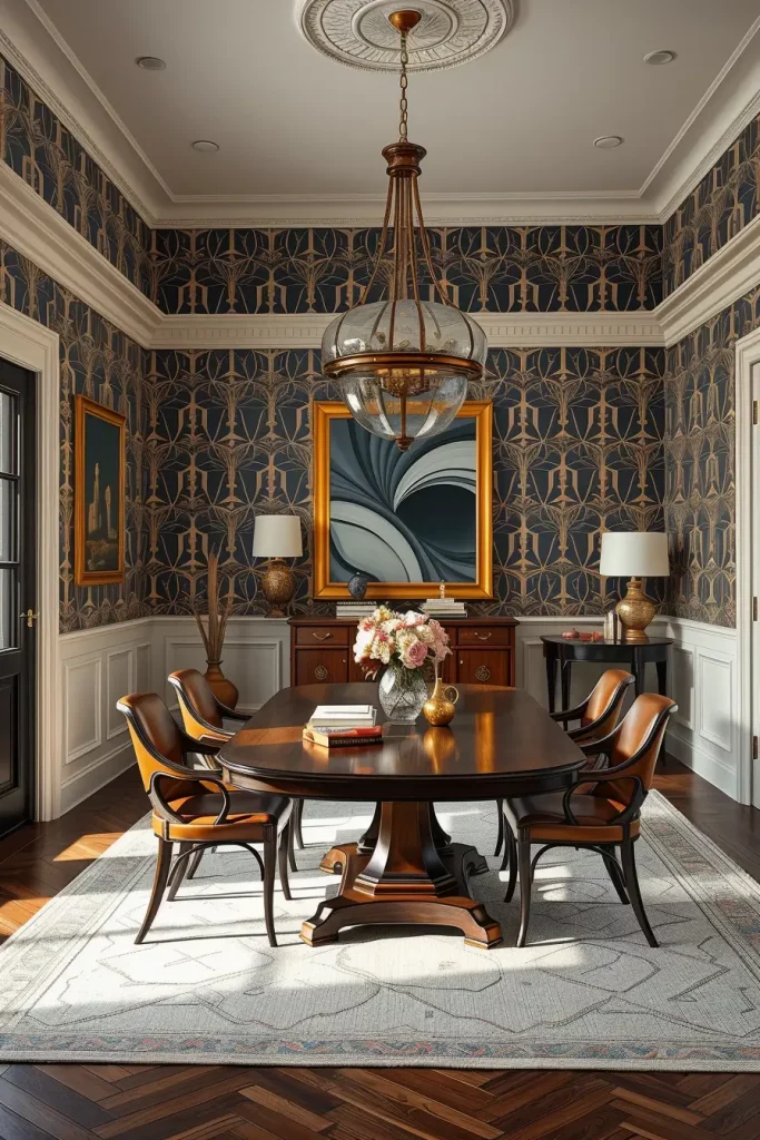 To achieve traditional elegance you should consider floral damask or chinoiserie motifs. The modern edge requires geometric patterns or metallic foils or abstract brushstroke designs as my selection. A combination of wainscoting with a wooden table and neutral leather chairs will perfectly match this wallpaper design. The room will find its balance through the use of delicate lighting fixtures made from crystal or smoked glass chandeliers.