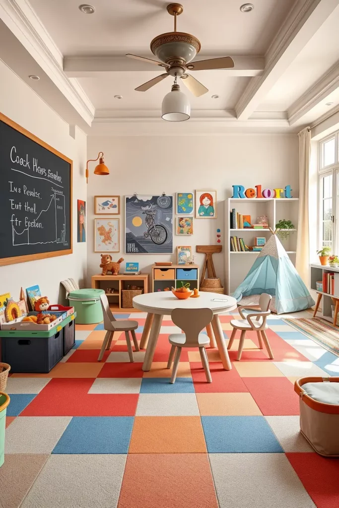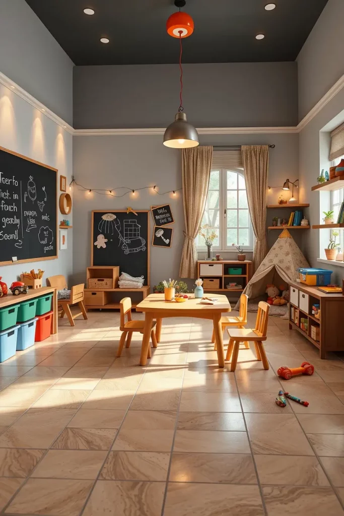 The foundation should include foam floor tiles together with low open shelving and child-size furniture. A chalkboard wall combined with a reading tent and a craft station featuring washable surfaces should be included. Wicker storage containers together with canvas storage bins and magnetic toy boards represent my preferred organizational method. The selection of long-lasting lighting fixtures should include overhead pendants with vibrant shades and wall sconces with gentle protective covers.