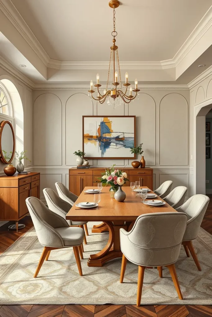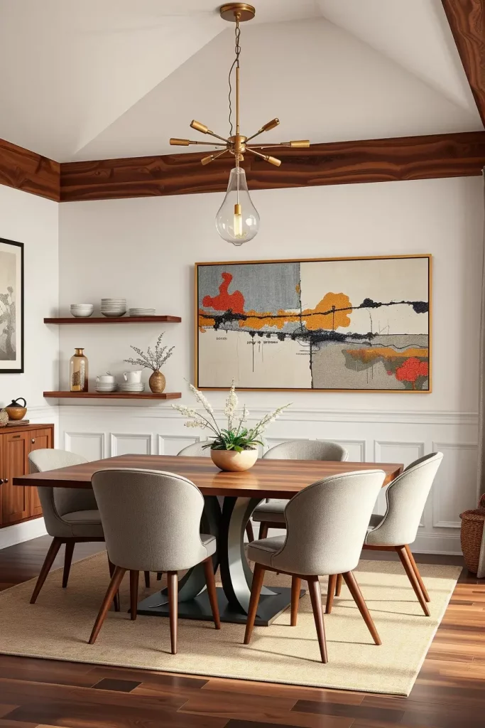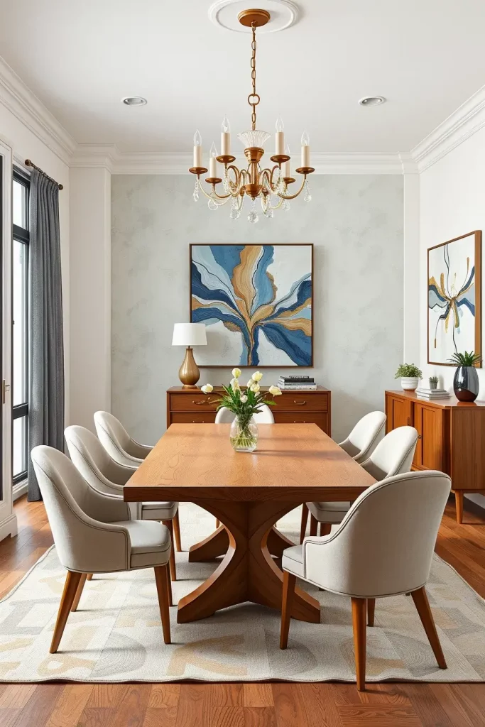The heavy wood tables should be replaced with slim-profile glass or marble or light oak furniture. The replacement of traditional carved chairs now includes upholstered shell chairs or mid-century silhouettes. A modern sideboard with concealed storage should be combined with a contemporary chandelier such as a Sputnik or linear pendant. A combination of vivid artwork featuring abstract designs will help unite everything in the room.