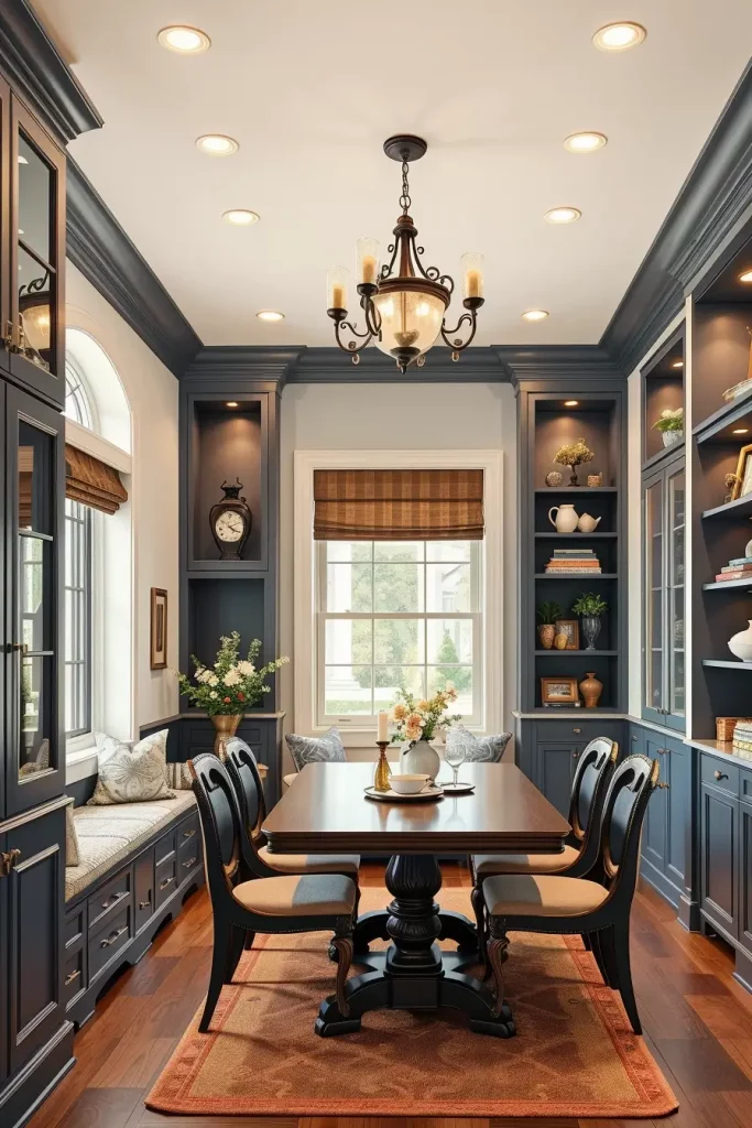You can enjoy your reading habit and seek tranquility through creating a personal library inside your dining area which provides a luxurious intellectual space. Most dining rooms with symmetrical structures work perfectly for this transformation through the addition of built-in shelves and elegant wall colors combined with comfortable seating.