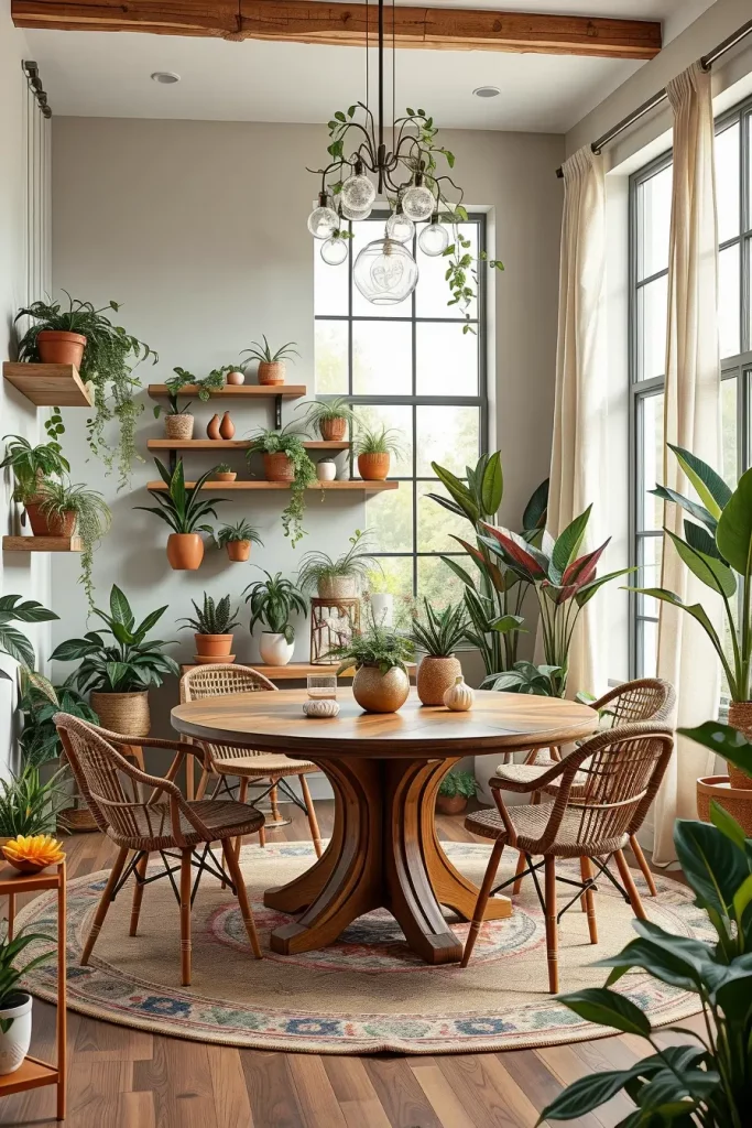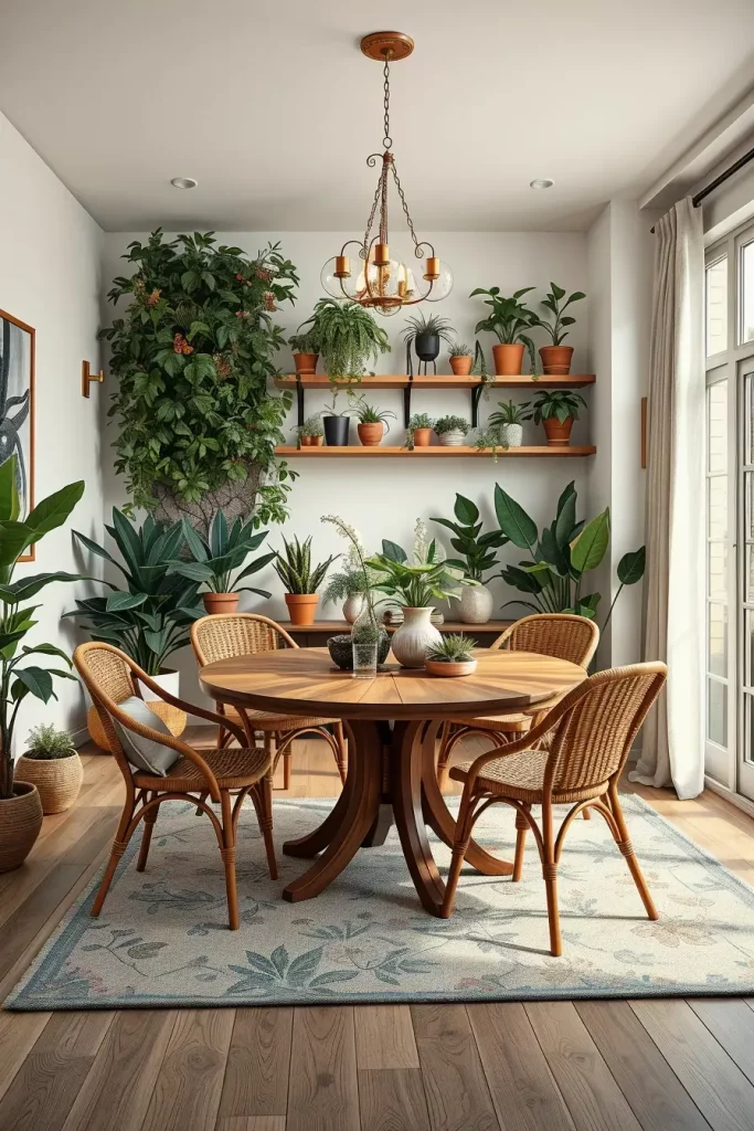 The function of this space stays intact through my selection of a round dining table made from reclaimed wood that rests alongside rattan or woven chairs which continue the natural design. The walls display open wooden shelves that show terracotta pots alongside vintage watering cans which create a rustic appeal. The vertical garden functions as an expressive living wall that covers the side of the room. The space maintains its charm through the addition of linen curtains and botanical prints and woven pendant lighting which do not dominate the room.
