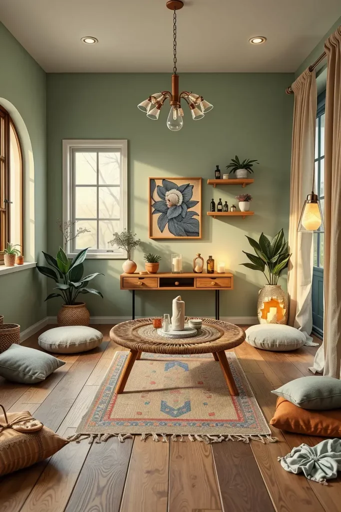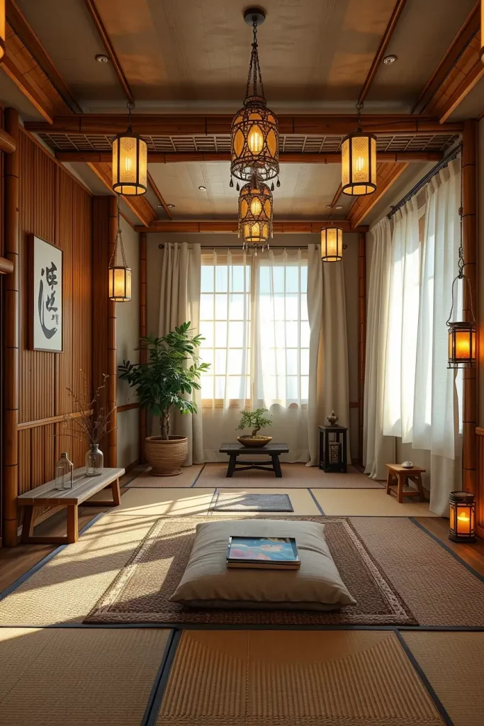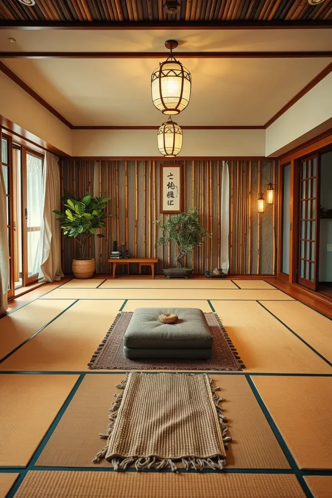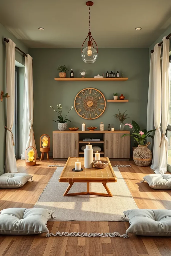 The room’s foundation consists of bamboo mats and cork flooring while its furniture includes only a single low wooden bench or floor cushions. The natural light passes through light linen drapes that act as window treatments and the room features a tabletop fountain combined with a bonsai tree. A calm atmosphere emerges when people use earth-toned paint and burn essential oils or incense.