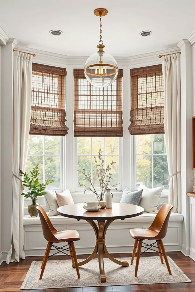 Window furnishings determine the entire atmosphere of a dining room although many people ignore their importance. Light-filtering linen curtains together with natural wood Roman shades brought a warm welcome to the space by substituting old drapery. The room appears fresh and unconfined when you select ivory and pale grey as your color palette.