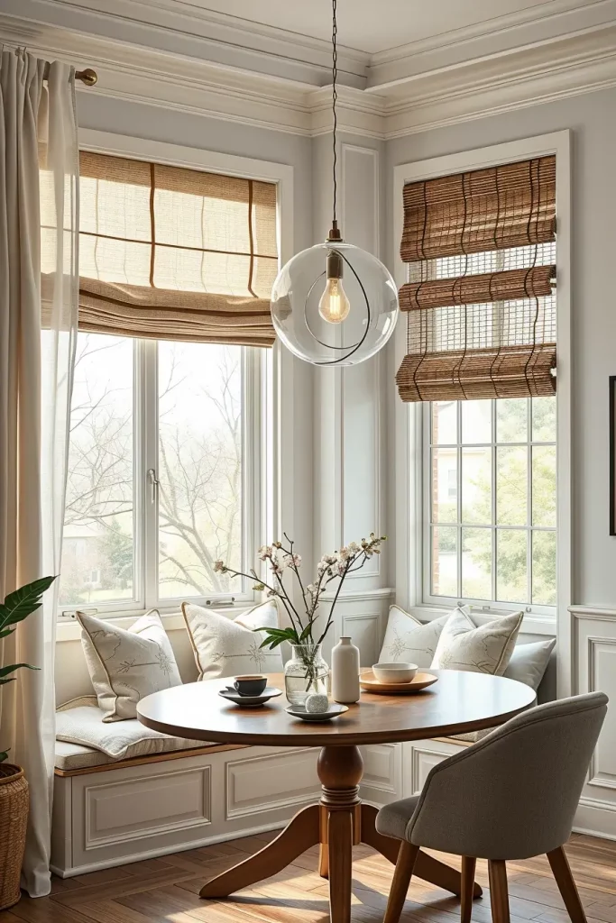 The layout contains a built-in banquette with stain-resistant fabric upholstery together with either an oval or round table to achieve maximum room movement. Floor-to-ceiling drapes and a statement pendant light above the table add elegance. The combination of pale gray together with creamy white and light blue creates a peaceful and neat atmosphere in the space.