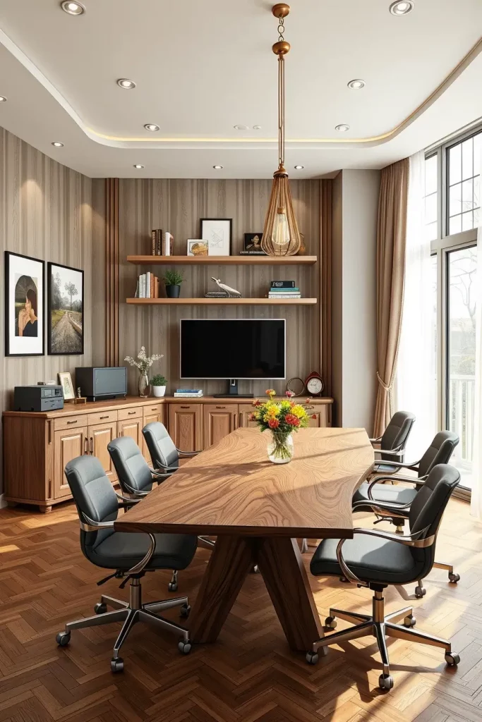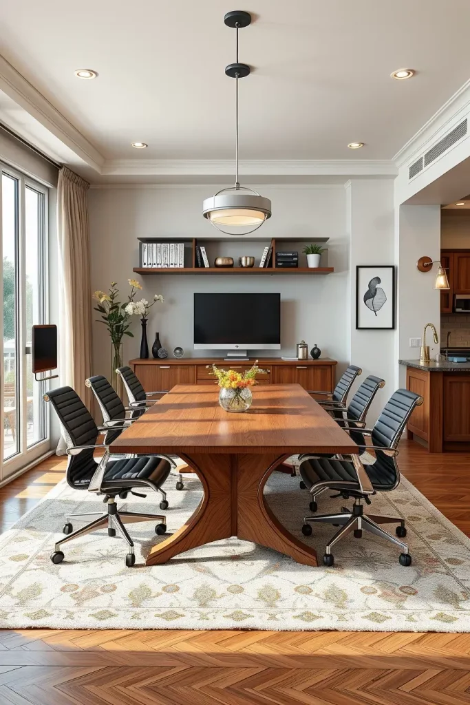 Working from home requires a sensible and stylish transformation of formal dining rooms into dual-purpose areas that incorporate home office elements. The space already includes sufficient space and central positioning which makes it an ideal choice for work-life balance design.