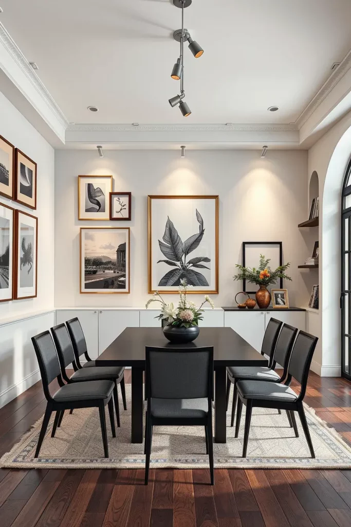 The artwork becomes the main focus when I choose matte neutral wall paint as the base. Multiple visual arrangements would suit a dining area that utilizes either floating shelves or pedestal displays. I choose either a minimal table or no table at all to create standing exhibit space. Key artwork pieces obtain the spotlight through the implementation of track lighting or museum-style picture lights.