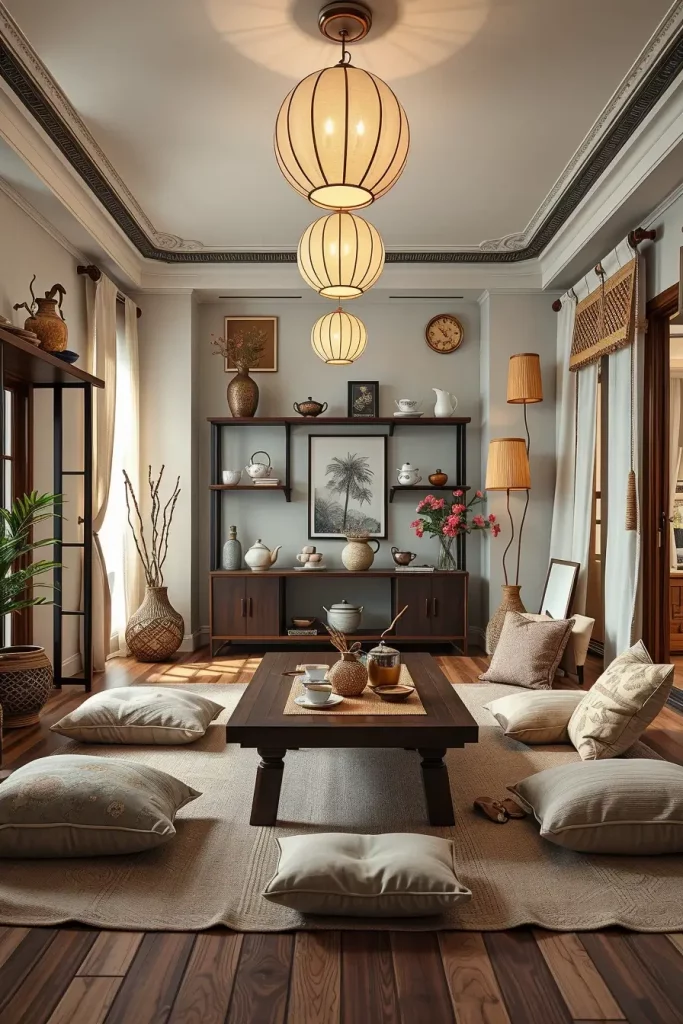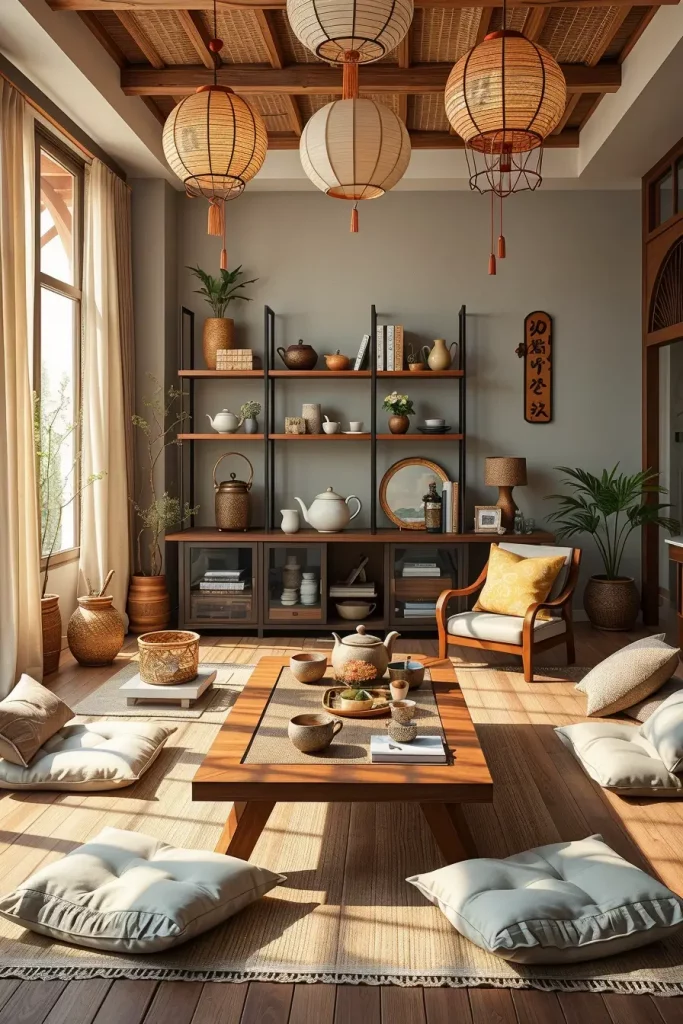 I prefer to arrange this space by placing wicker chairs and upholstered armchairs next to a central tea table. Lighting with both paper lanterns and wall sconces creates the perfect setting to build ambiance in this room. The room receives its charm from botanical wallpaper and delicate teacup storage and floor cushions that add comfort.