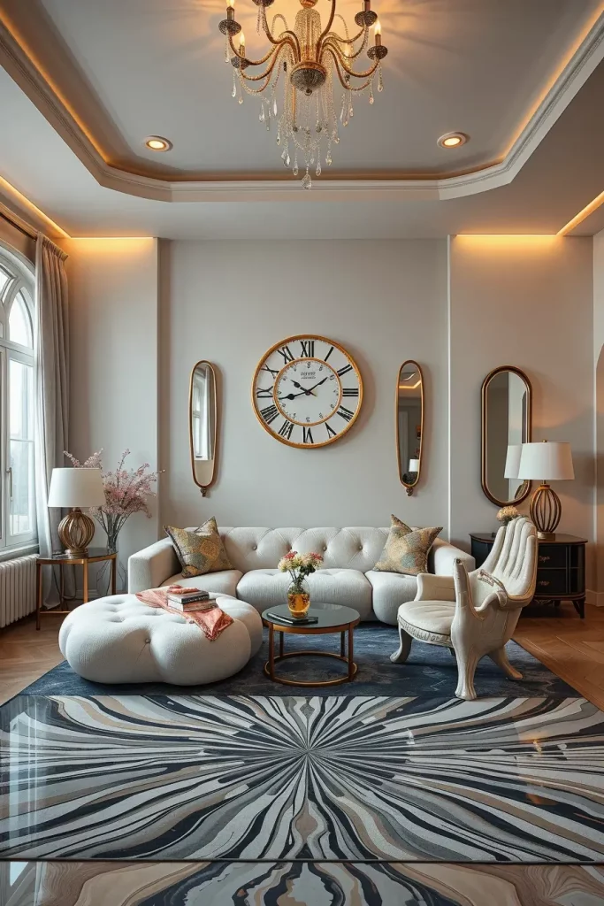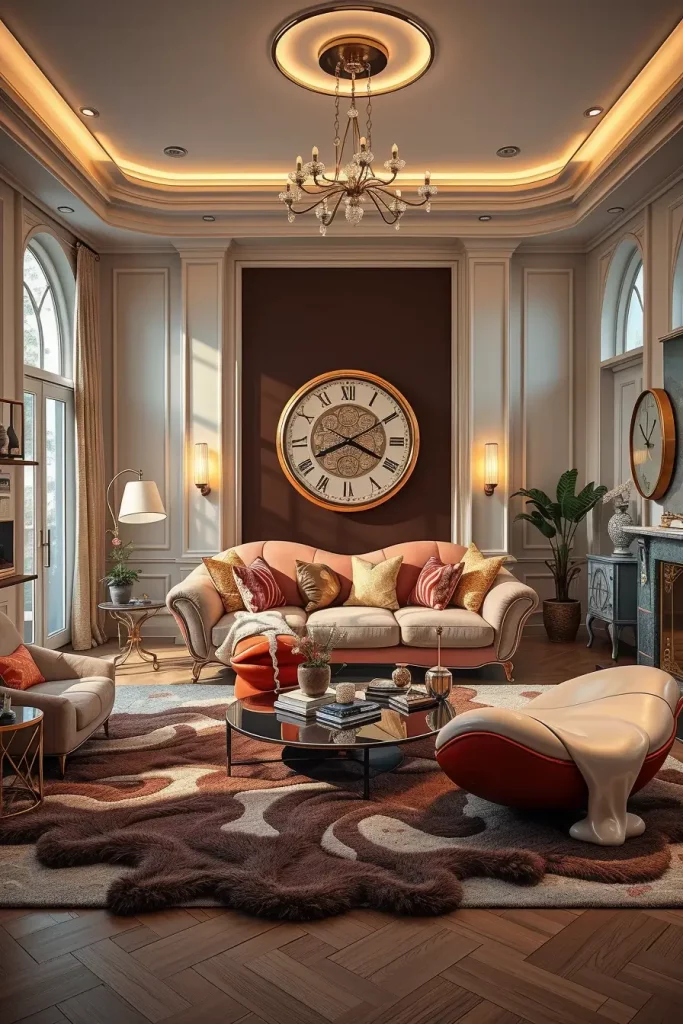 In terms of decor I would suggest sculptural sofas with exaggerated curves, surrealist inspired coffee tables and art that breaks the perception. Everything can be united by accents in chairs in unusual shapes, huge wall paintings, and deformed mirrors. Even minor details such as playful cushions or carpets with optical illusions can change the atmosphere.