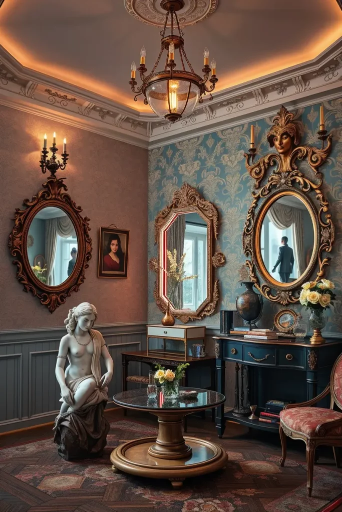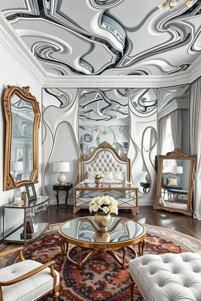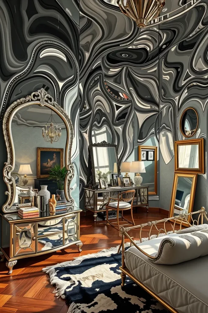 In a practical sense, I recommend investing in custom mirrors of irregular shapes or frames that are more sculptural. Large mirrored panels behind furniture or wavy designs above fireplaces can enhance the surrealist theme without being useless.